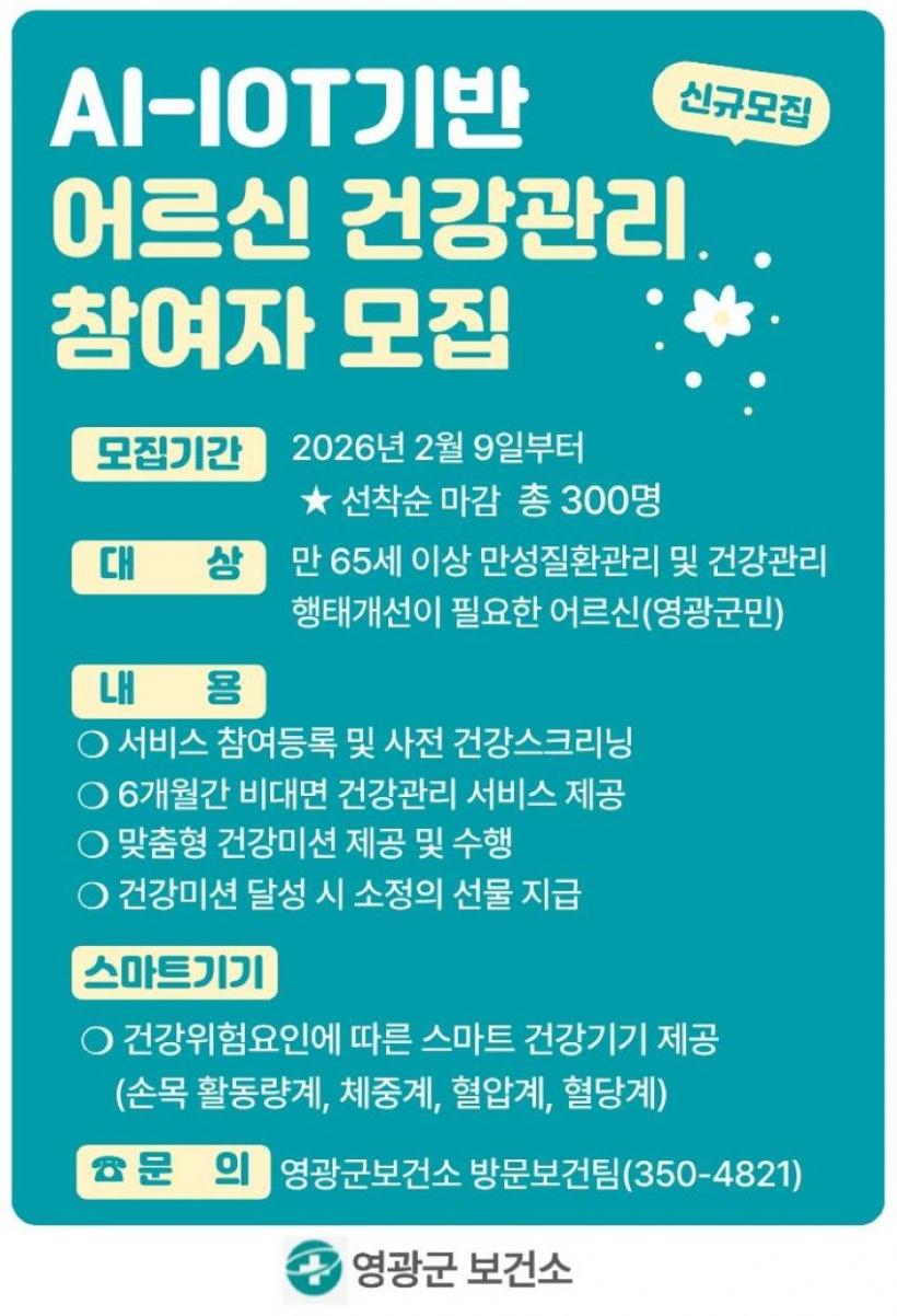 [°ø°£´º½º = ±è¼ö±Ù±âÀÚ] ¿µ±¤±ºÀº Ãʰí·ÉÈ ½Ã´ë¿¡ ´ëºñÇØ 65¼¼ ÀÌ»ó ¿µ±¤±º¹ÎÀ» ´ë»óÀ¸·Î AI・IoT(ÀΰøÁö´É»ç¹°ÀÎÅͳÝ)±â¹Ý ¾î¸£½Å °Ç°°ü¸®»ç¾÷ ½Å±Ô Âü¿©ÀÚ 300¸íÀ» 2¿ù 9ÀϺÎÅÍ ¼±Âø¼ø ¸ðÁýÇÑ´Ù°í ¹àÇû´Ù.