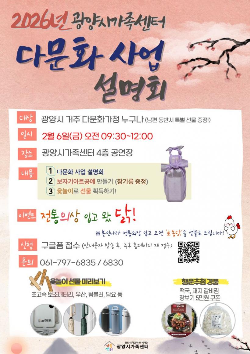 [°ø°£´º½º = Àå¿ÁÁø±âÀÚ] ±¤¾ç½Ã°¡Á·¼¾ÅÍ´Â 2026³â¿¡ ½ÃÇàÇÏ´Â ´Ù¹®È°¡Á· Áö¿ø»ç¾÷¿¡ ´ëÇÑ ÀÌÇØ¸¦ µ½±â À§ÇØ ¿À´Â 2¿ù 6ÀÏ(±Ý) ¿ÀÀü 9½Ã 30ºÐ, ±¤¾ç½Ã °¡Á·¹®È¼¾ÅÍ 4Ãþ °¡Á·°ø¿¬Àå¿¡¼ ¡®2026³â ´Ù¹®È»ç¾÷ ¼³¸íȸ¡¯¸¦ °³ÃÖÇÑ´Ù°í ¹àÇû´Ù.