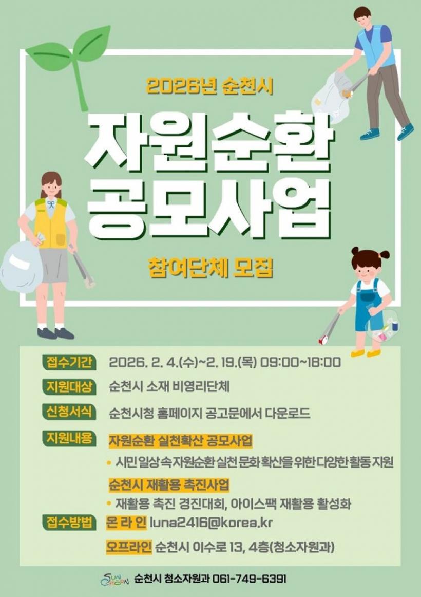 [°ø°£´º½º = ±è¿ëÁø±âÀÚ] ¼øÃµ½Ã´Â ½Ã¹ÎÀÇ ÀÏ»ó ¼Ó ÀÚ¿ø¼øÈ¯ ¹®È È®»ê°ú ÀçȰ¿ë ½Çõ Ȱ¼ºÈ¸¦ À§ÇØ 2026³â ÀÚ¿ø¼øÈ¯ °ø¸ð»ç¾÷ Âü¿© ´Üü¸¦ ¸ðÁýÇÑ´Ù°í ¹àÇû´Ù.