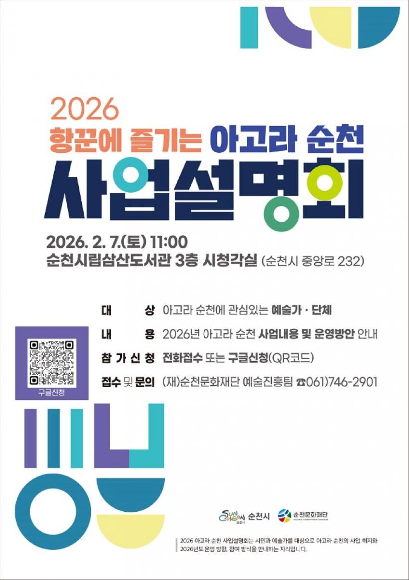 [°ø°£´º½º = ±è¿ëÁø±âÀÚ] (Àç)¼øÃµ¹®ÈÀç´ÜÀº ¿À´Â 7ÀÏ 11½Ã ¼øÃµ»ï»ê½Ã¸³µµ¼°ü ½Ãû°¢½Ç¿¡¼ Áö¿ª¿¹¼úÀΰú ½Ã¹ÎÀ» ´ë»óÀ¸·Î ¡®2026 Çײۿ¡ Áñ±â´Â ¾Æ°í¶ó ¼øÃµ(ÀÌÇÏ ¾Æ°í¶ó ¼øÃµ)¡¯ »ç¾÷¼³¸íȸ¸¦ °³ÃÖÇÑ´Ù.