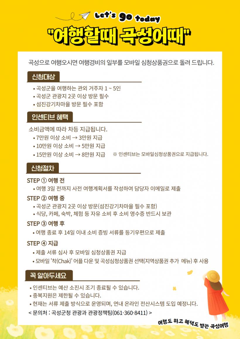 Âü¿© ¹æ¹ýµµ °£´ÜÇÏ´Ù. ¿©Çà 3ÀÏ Àü±îÁö »çÀü ¿©Çà°èȹ¼¸¦ ´ã´çÀÚ À̸ÞÀÏ·Î Á¦ÃâÇÑ ÈÄ °î¼º ¿©ÇàÀ» Áñ±ä ÈÄ ¿©Çà Á¾·á ÈÄ 14ÀÏ À̳» ¼Òºñ ¿µ¼öÁõ µî Áõºù¼·ù¸¦ µî±â¿ìÆíÀ¸·Î Á¦ÃâÇÏ¸é µÈ´Ù.