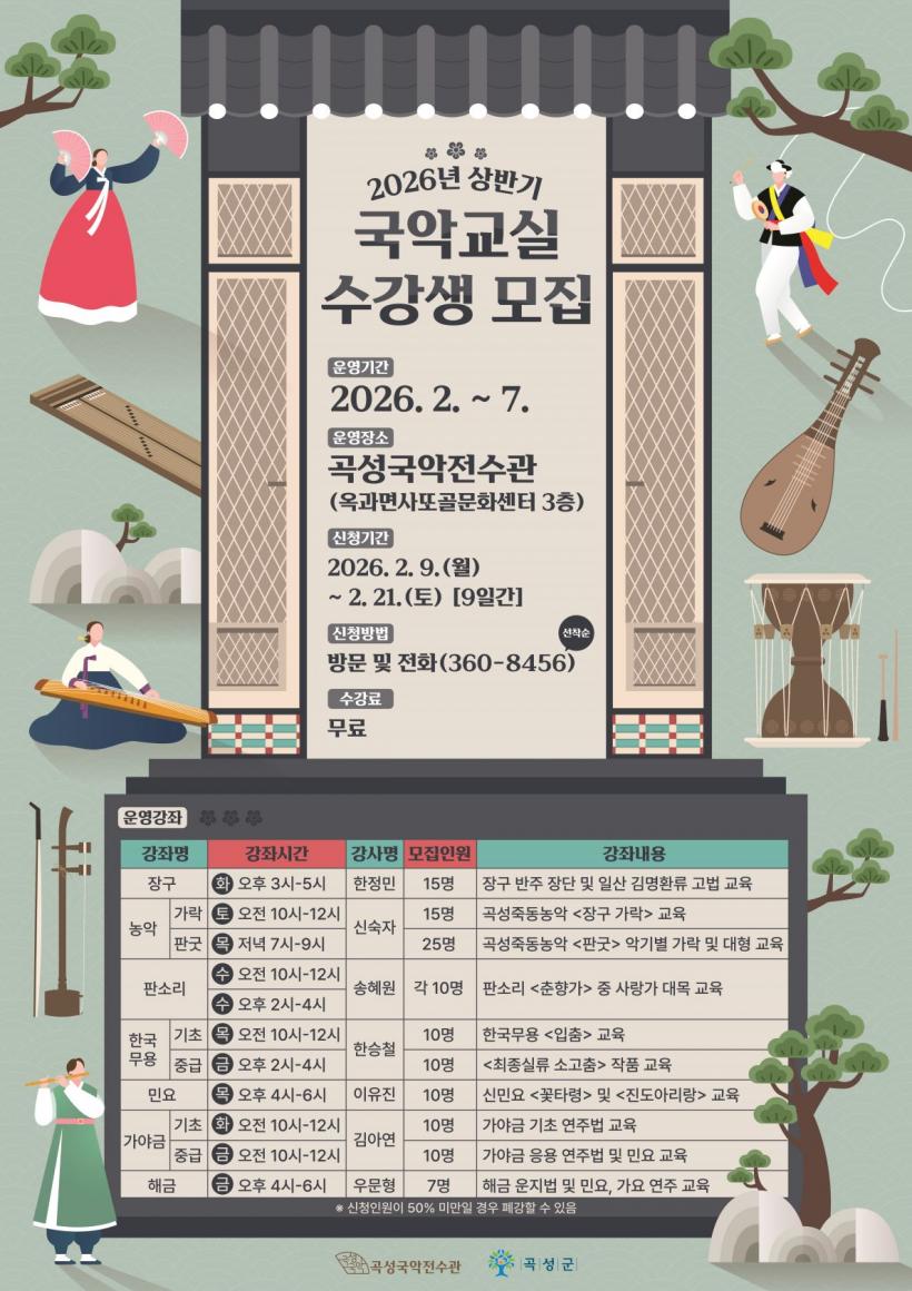 À̹ø ±¹¾Ç±³½Ç ¼ö°»ý ¸ðÁý ±â°£Àº ¿À´Â 9ÀϺÎÅÍ 21ÀϱîÁöÀÌ¸ç °Á´ 2¿ù Áß¼øºÎÅÍ 7¿ù±îÁö ÁÖ 1~2ȸ 2½Ã°£¾¿ ¿î¿µµÈ´Ù. Àå¼Ò´Â ¿Á°ú¸é ¼ÒÀç »ç¶Ç°ñ¹®È¼¾ÅÍ(3Ãþ) °î¼º±¹¾ÇÀü¼ö°üÀÌ´Ù.