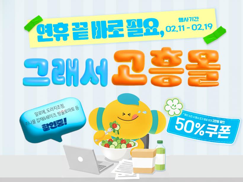 °íÈï¸ôÀº ¿À´Â 2¿ù 11ÀϺÎÅÍ 19ÀϱîÁö 9Àϰ£ ¡®¿¬ÈÞ ³¡ ¹Ù·Î ÇÊ¿ä, ±×·¡¼ °íÈï¸ô¡¯ ±âȹÀüÀ» ¿°í ¾Ë·Î¿¡, µµ¶óÁöû, Ã볪¹° ¼ÎÀÌÅ© µî °Ç° ¸Ô°Å¸®¸¦ ÃÖ´ë 50% ÇÒÀÎ ÆÇ¸ÅÇÑ´Ù°í ¹àÇû´Ù.