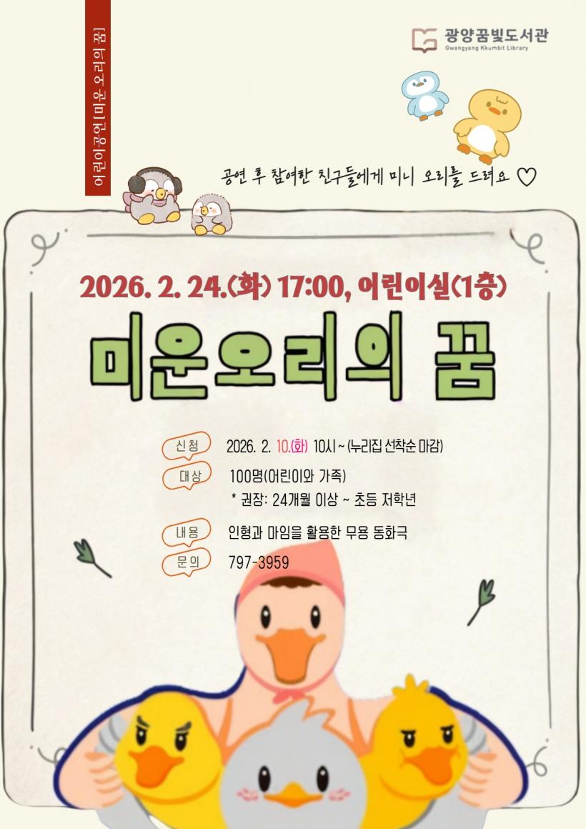 [°ø°£´º½º = Àå¿ÁÁø±âÀÚ] ±¤¾ç²Þºûµµ¼°üÀº µ¿È ¡®¹Ì¿î ¿À¸® »õ³¢¡¯¸¦ Çö´ëÀûÀ¸·Î ÀçÇØ¼®ÇÑ ¾î¸°ÀÌ ¹«¿ë µ¿È±Ø ¡®¹Ì¿î ¿À¸®ÀÇ ²Þ¡¯À» ¿À´Â 2¿ù 24ÀÏ µµ¼°ü¿¡¼ ¾î¸°ÀÌ¿Í °¡Á· °ü°´À» ´ë»óÀ¸·Î ¼±º¸ÀÎ´Ù°í ¹àÇû´Ù.