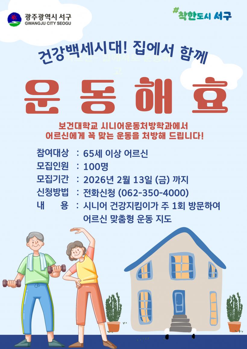 [°ø°£´º½º = ±è´ë¿µ±âÀÚ] ±¤ÁÖ±¤¿ª½Ã ¼±¸(±¸Ã»Àå ±èÀ̰)°¡ °Ç°Çϰí Ȱ±âÂù ³ëÈÄ »ýȰ Áö¿øÀ» À§ÇØ ¾î¸£½Å 100¸íÀ» ´ë»óÀ¸·Î ã¾Æ°¡´Â ¸ÂÃãÇü °Ç° ÇÁ·Î±×·¥ÀÎ ¡®³ë³ëÄÉ¾î ¿îµ¿ÇØÈ¿(üø)¡¯ »ç¾÷À» ÃßÁøÇÑ´Ù.