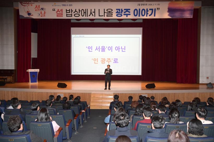[°ø°£´º½º = ±è¼ö±Ù±âÀÚ] ±¤ÁÖ±¤¿ª½Ã(½ÃÀå °±âÁ¤)´Â 11ÀÏ ½Ãû ´ëȸÀǽǿ¡¼ ¡®¼³ ¹ä»ó¿¡¼ ³ª¿Ã ±¤ÁÖ À̾߱⡯¸¦ ÁÖÁ¦·Î ¡®2¿ù Á¤·ÊÁ¶È¸¡¯¸¦ °³ÃÖ, ÅëÇÕÀ¸·Î ´õ Å©°í ±í¾îÁú ±¤ÁÖÀÇ ¹Ì·¡ ±¸»óÀ» °øÀ¯Çß´Ù.