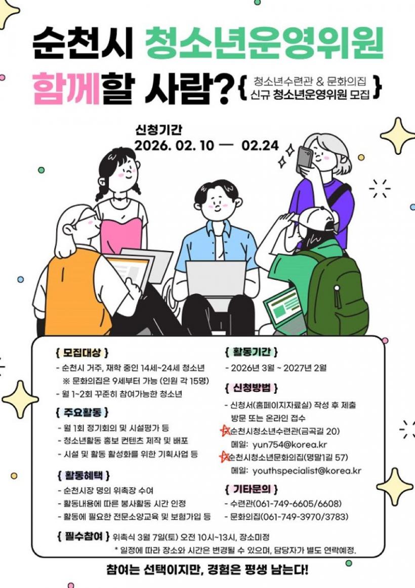 [°ø°£´º½º = ±è¿ëÁø±âÀÚ] ¼øÃµ½Ã û¼Ò³â¼ö·Ã°ü°ú ¹®ÈÀÇÁýÀº û¼Ò³âÀÇ Âü¿©±Ç È®´ë¿Í û¼Ò³â Ä£ÈÀû ½Ã¼³¿î¿µÀ» À§ÇØ Ã»¼Ò³â¿î¿µÀ§¿øÈ¸¸¦ ¸ðÁýÇÑ´Ù.