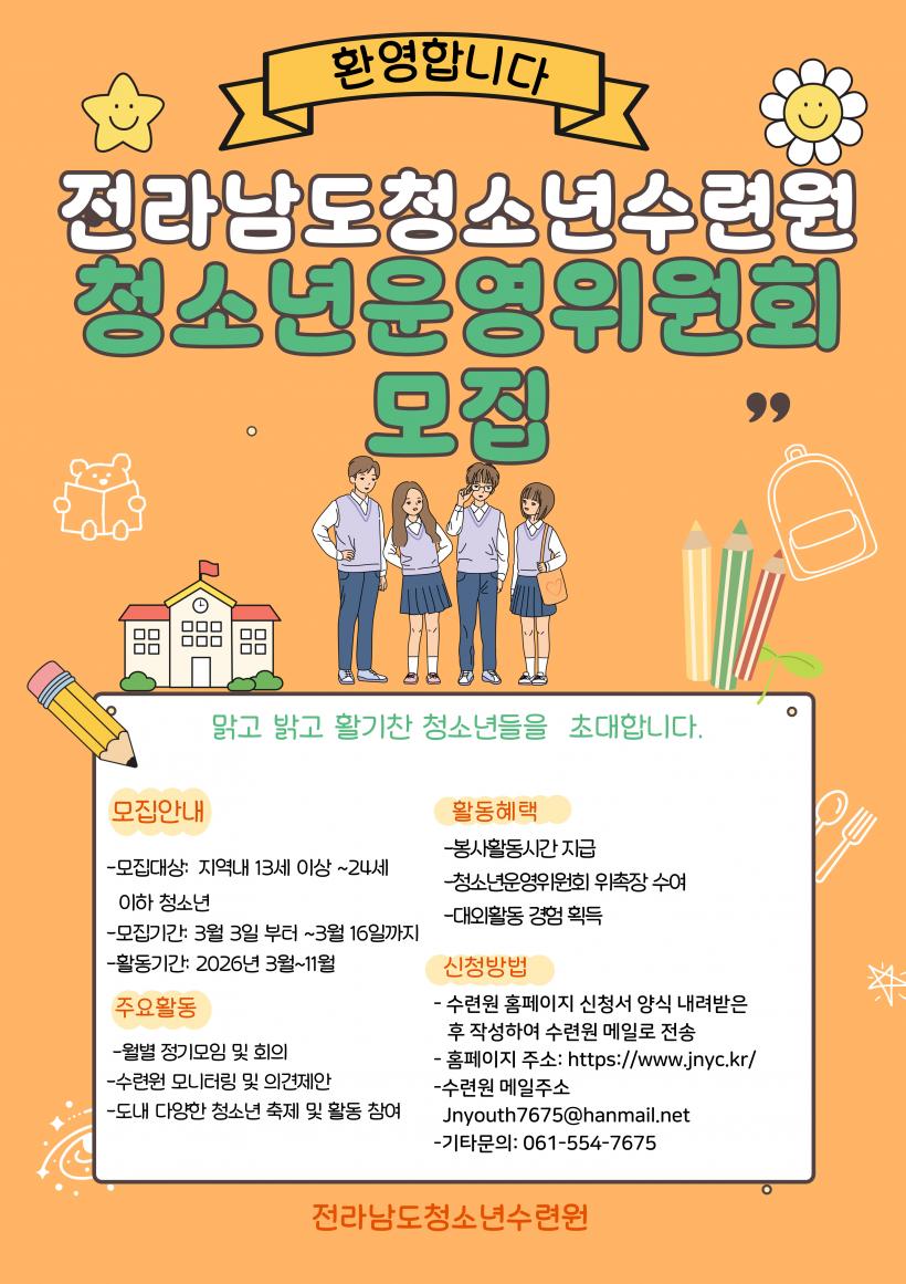 [°ø°£´º½º = ±è¼ö±Ù±âÀÚ] Àü¶ó³²µµÃ»¼Ò³â¼ö·Ã¿ø(¿øÀå ÀÌÃẹ)Àº 2026³â Àü¶ó³²µµÃ»¼Ò³â¼ö·Ã¿ø û¼Ò³â¿î¿µÀ§¿øÈ¸¸¦ ¿À´Â 3¿ù 3ÀϺÎÅÍ 3¿ù 16ÀÏ 18½Ã±îÁö Áö¿ª ³» û¼Ò³âÀ» ´ë»óÀ¸·Î ¸ðÁýÇÑ´Ù.