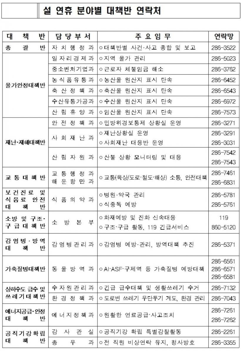 À̸¦ À§ÇØ ÀÚÄ¡ÇàÁ¤°ú¿¡ Á¾ÇÕ»óȲ½ÇÀ» ¼³Ä¡ÇÏ°í ºÐ¾ßº° ´ëÃ¥¹Ý »óȲ½ÇÀ» ÇÔ²² ¿î¿µÇØ ¿¬ÈÞ ±â°£ ÇàÁ¤ °ø¹éÀ» ÃÖ¼ÒÈÇÑ´Ù. ÃÑ 11°³ ´ëÃ¥¹Ý¿¡ ÇÏ·ç Æò±Õ 48¸í(µµ 29¡¤¼Ò¹æº»ºÎ 19), ¿¬Àοø 239¸íÀÌ ±Ù¹«ÇÑ´Ù. ´ëÃ¥¹ÝÀº ÇØ´ç ºÎ¼Àå Ã¥ÀÓÇÏ¿¡ 24½Ã°£ ºñ»ó±Ù¹«Ã¼°è¸¦ À¯ÁöÇÑ´Ù.