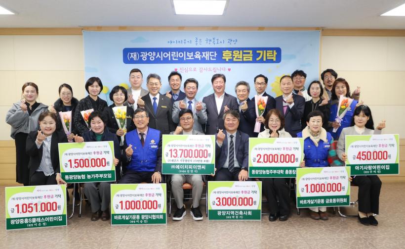 À̹ø ±âŹ½Ä¿¡¼´Â Áö¿ª ±â¾÷°ú ´Üü, º¸À°ÇöÀåÀÌ ÇÔ²² ¶æÀ» ¸ð¾Æ ÃÑ 2,370¸¸ ¿ø »ó´çÀÇ ÈÄ¿ø±ÝÀ» Àü´ÞÇßÀ¸¸ç, Âü¿© ±â°üº° ±âŹ ±Ý¾×Àº ¡ã(ÁÖ)¿¡ÀÌÄ¡ÇÇÀ̾ؾ¾(ºÎ´ëÇ¥ ±è¸¸½Ä) 1,370¸¸ ¿ø ¡ã±¤¾çÁö¿ª°ÇÃà»çȸ(ȸÀå ¹Úµ¿±â) 300¸¸ ¿ø ¡ãµ¿±¤¾ç³óÇù ÁֺδëÇÐ Ãѵ¿Ã¢È¸(ȸÀå ÀÌÁ¤¼ø) 200¸¸ ¿ø ¡ãµ¿±¤¾ç³óÇù ³ó°¡ÁֺθðÀÓ(ȸÀå ¹Ú¸Í¿±) 150¸¸ ¿ø ¡ã¹Ù¸£°Ô»ì±â¿îµ¿ ±¤¾ç½ÃÇùÀÇȸ(ȸÀå À̽¾È) 100¸¸ ¿ø ¡ã¹Ù¸£°Ô»ì±â¿îµ¿ ±ÝÈ£µ¿À§¿øÈ¸(Àü À§¿øÀå ½É¼ø¾Ö) 100¸¸ ¿ø ¡ã±¤¾çÁßÈï SŬ·¡½º¾î¸°ÀÌÁý(¿øÀå ÀÌÀºÁ¤) 105¸¸1,000¿ø ¡ã¾Æ±â»ç¶û¾î¸°ÀÌÁý(¿øÀå Áֹ̼±) 45¸¸ ¿ø, ÃÑ 2,370¸¸ ¿ø »ó´çÀÌ´Ù.