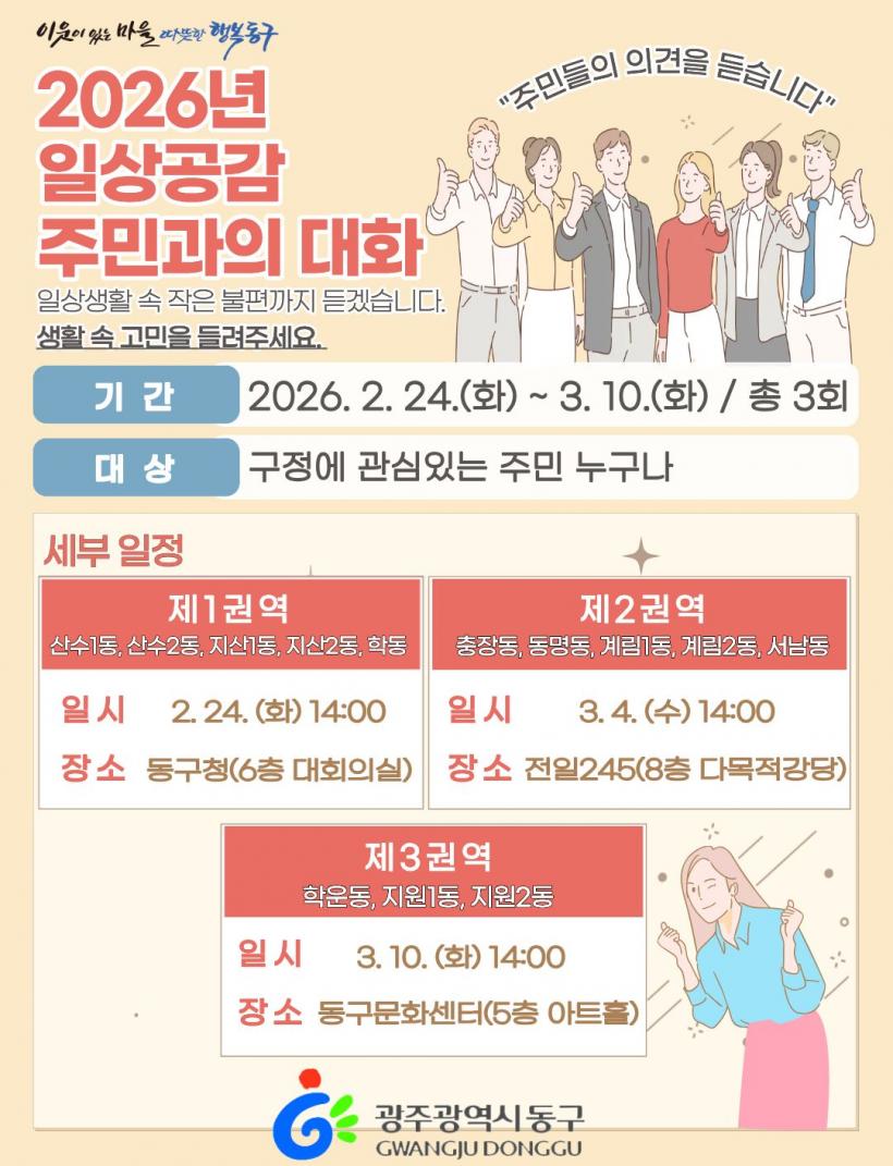 [°ø°£´º½º = ±è´ë¿µ±âÀÚ] ±¤ÁÖ µ¿±¸´Â ÁֹεéÀÇ ÀÏ»ó ¼Ó ÀÛÀº ºÒÆí°ú »ýȰ Çö¾ÈÀ» °¡±îÀÌ¿¡¼ µè°í À̸¦ ±¸Á¤¿¡ Àû±Ø ¹Ý¿µÇϱâ À§ÇØ ¡®ÀÏ»ó°ø°¨ ÁֹΰúÀÇ ´ëÈ¡¯¸¦ ÃßÁø, »ýȰ¹ÐÂøÇü ¼ÒÅë¿¡ ³ª¼±´Ù°í ¹àÇû´Ù.