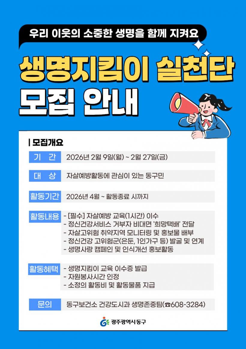 [°ø°£´º½º = ±è´ë¿µ±âÀÚ] ±¤ÁÖ µ¿±¸´Â ¿À´Â 27ÀϱîÁö Á¤½Å°Ç° ÁõÁø°ú Àڻ쿹¹æ¿¡ °ü½É ÀÖ´Â ÁÖ¹ÎÀ» ´ë»óÀ¸·Î ¡®»ý¸íÁöÅ´ÀÌ ½Çõ´Ü¡¯À» ¸ðÁýÇÑ´Ù°í ¹àÇû´Ù.