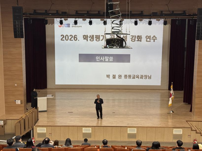 [°ø°£´º½º = ±è¼ö±Ù±âÀÚ] Àü¶ó³²µµ±³À°Ã»(±³À°°¨ ±è´ëÁß)Àº 2026Çг⵵ 1Çб⸦ ¾ÕµÎ°í °íµîÇб³ ÇлýÆò°¡ °øÁ¤¼º °È¸¦ À§ÇÑ ¿¬¼ö¸¦ ¿î¿µÇÑ´Ù. À̹ø ¿¬¼ö´Â 2026³âÀ» ¡®ÇлýÆò°¡ ¼±µµ±³À°Ã» µµ¾àÀÇ ÇØ¡¯·Î Á¤ÇÏ°í Æò°¡ÀÇ °øÁ¤¼º°ú Àü¹®¼º °È¸¦ ÃßÁøÇÏ´Â Á¤Ã¥ ¹æÇâ¿¡ µû¶ó ¸¶·ÃµÆ´Ù.