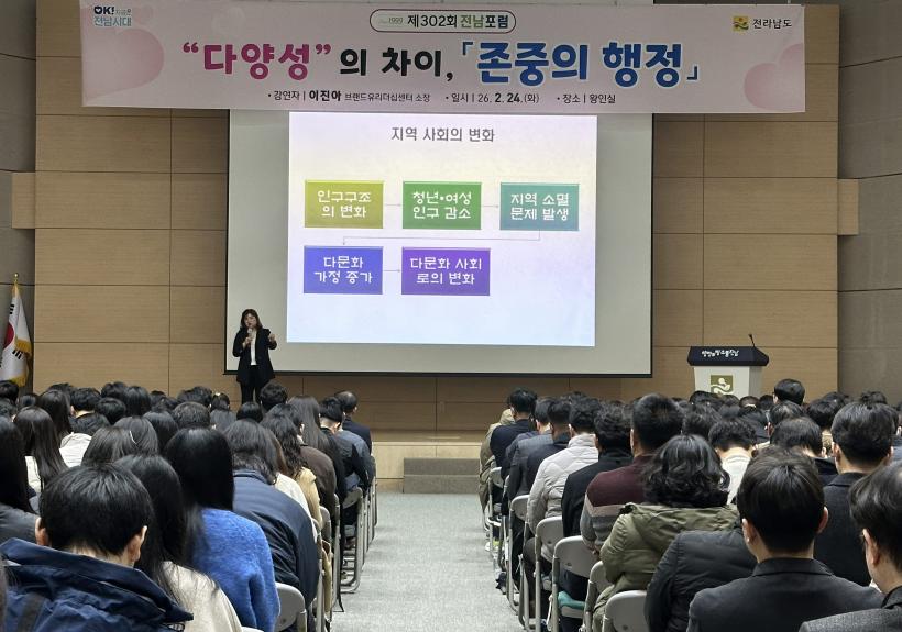 [°ø°£´º½º = ±è¼ö±Ù±âÀÚ] Àü¶ó³²µµ´Â 24ÀÏ µµÃ» ¿ÕÀνǿ¡¼ °øÁ÷ÀÚ 300¿© ¸íÀ» ´ë»óÀ¸·Î ÀÌÁø¾Æ ºê·£µåÀ¯¸®´õ½Ê¼¾ÅÍ ¼ÒÀåÀ» ÃÊÃ»ÇØ ¡®´Ù¾ç¼ºÀÇ Â÷ÀÌ, Á¸ÁßÀÇ ÇàÁ¤¡¯À» ÁÖÁ¦·Î Á¦302ȸ Àü³²Æ÷·³À» ¿¾ú´Ù.