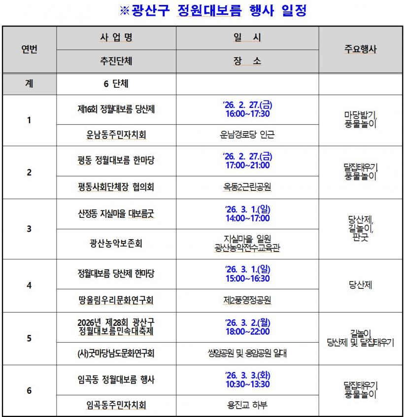 [°ø°£´º½º = ±è´ë¿µ±âÀÚ] ±¤ÁÖ ±¤»ê±¸´Â ¿À´Â 2¿ù 27ÀϺÎÅÍ 3¿ù 3ÀϱîÁö ÀÌ¿ô°ú ÇÔ²² ÀüÅëÀ» Áñ±â°í ¸¶À»ÀÇ Æò¾ÈÀ» ±â¿øÇÏ´Â 2026³â Á¤¿ù´ëº¸¸§ Çà»ç°¡ Áö¿ª °÷°÷¿¡¼ ÆîÃÄÁø´Ù°í ¹àÇû´Ù.