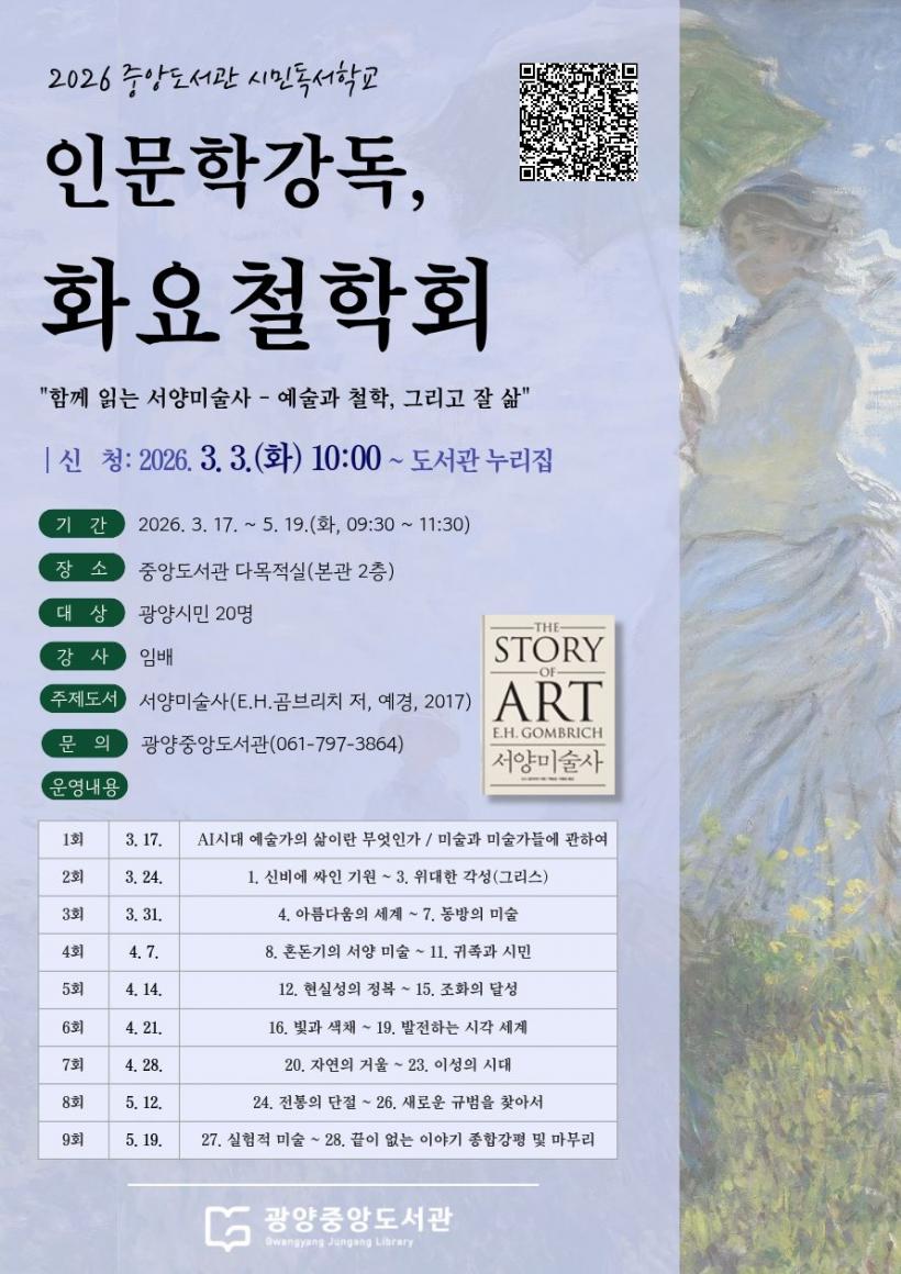 ¡®Àι®Çаµ¶-È¿äöÇÐȸ¡¯´Â ¡®ÇÔ²² Àд ¼¾ç¹Ì¼ú»ç – ¿¹¼ú°ú öÇÐ, ±×¸®°í Àß »î¡¯À» ÁÖÁ¦·Î ¿¡¸¥½ºÆ® °õºê¸®Ä¡ÀÇ ¡¸¼¾ç¹Ì¼ú»ç¡¹¸¦ ÇÔ²² ÀÐÀ¸¸ç ¼¾ç¹Ì¼ú°ú öÇÐÀ» ޱ¸ÇÏ´Â Àι®ÇÐ °µ¶ ÇÁ·Î±×·¥ÀÌ´Ù. ¿¹¼ú ÀÛǰ¿¡ ´ã±ä öÇÐÀû Àǹ̸¦ ÅëÇØ Àΰ£ÀÇ »îÀ» ¼ºÂûÇϰí Àι®ÇÐÀû »ç°í¸¦ È®ÀåÇÒ ¼ö ÀÖµµ·Ï ±¸¼ºÇßÀ¸¸ç, öÇп¡ °ü½ÉÀº ÀÖÁö¸¸ È¥ÀÚ ½ÃÀÛÇϱ⠾î·Á¿î ½Ã¹Îµéµµ ºÎ´ã ¾øÀÌ Âü¿©ÇÒ ¼ö ÀÖ´Ù.