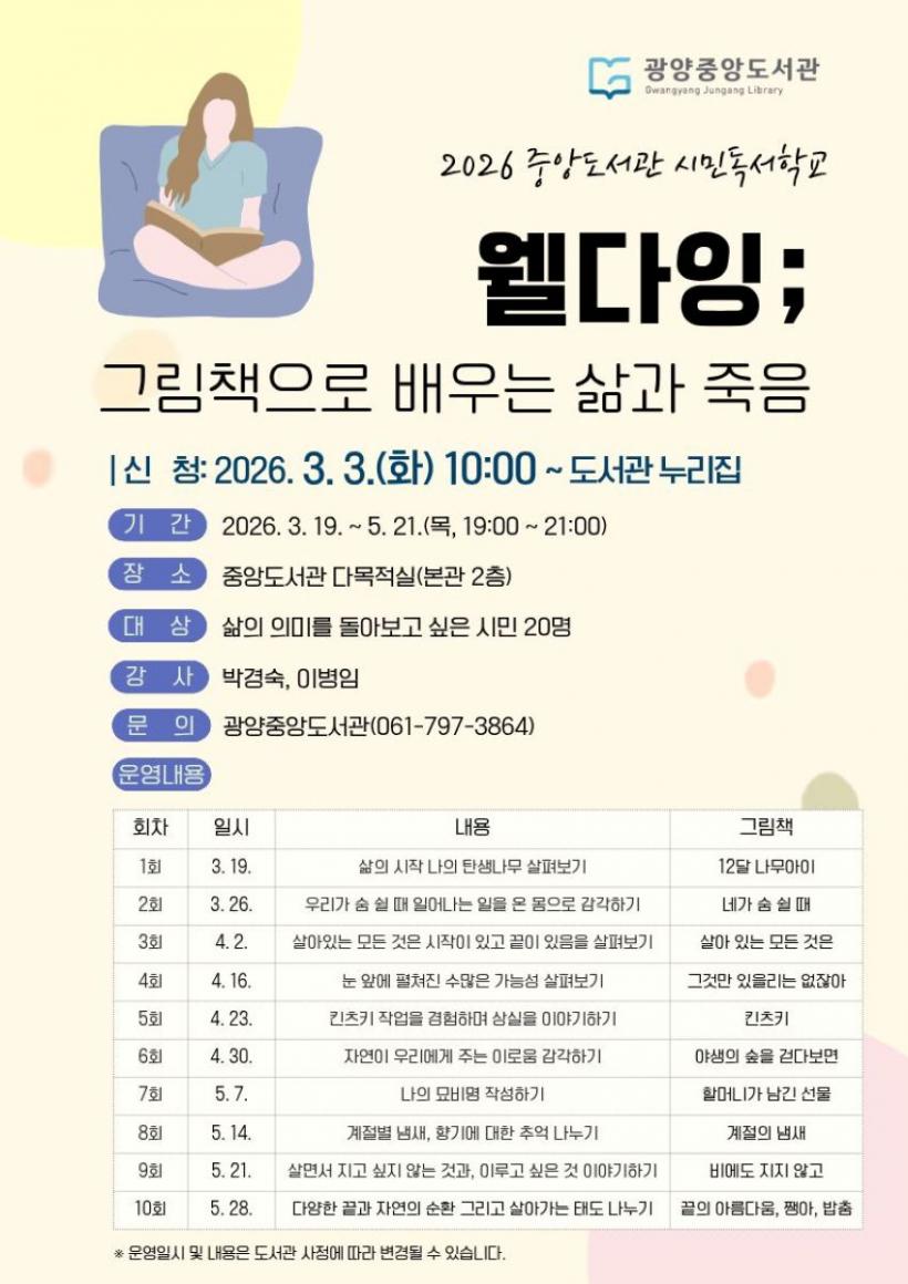 ¡®À£´ÙÀ×; ±×¸²Ã¥À¸·Î ¹è¿ì´Â »î°ú Á×À½¡¯Àº ±×¸²Ã¥À» ¸Å°³·Î »î°ú Á×À½À» ÀÚ¿¬½º·´°Ô À̾߱âÇÏ´Â ¾ß°£ Àι® ÇÁ·Î±×·¥ÀÌ´Ù. Â÷½Ãº° ±×¸²Ã¥ Àбâ¿Í Âü¿©ÀÚ °£ ´ëȸ¦ ÅëÇØ °¨Á¤À» ³ª´©°í Á¸¾öÇÑ »î°ú Á×À½ÀÇ Àǹ̸¦ ÇÔ²² ¼ºÂûÇÏ´Â ½Ã°£À» Á¦°øÇÑ´Ù.