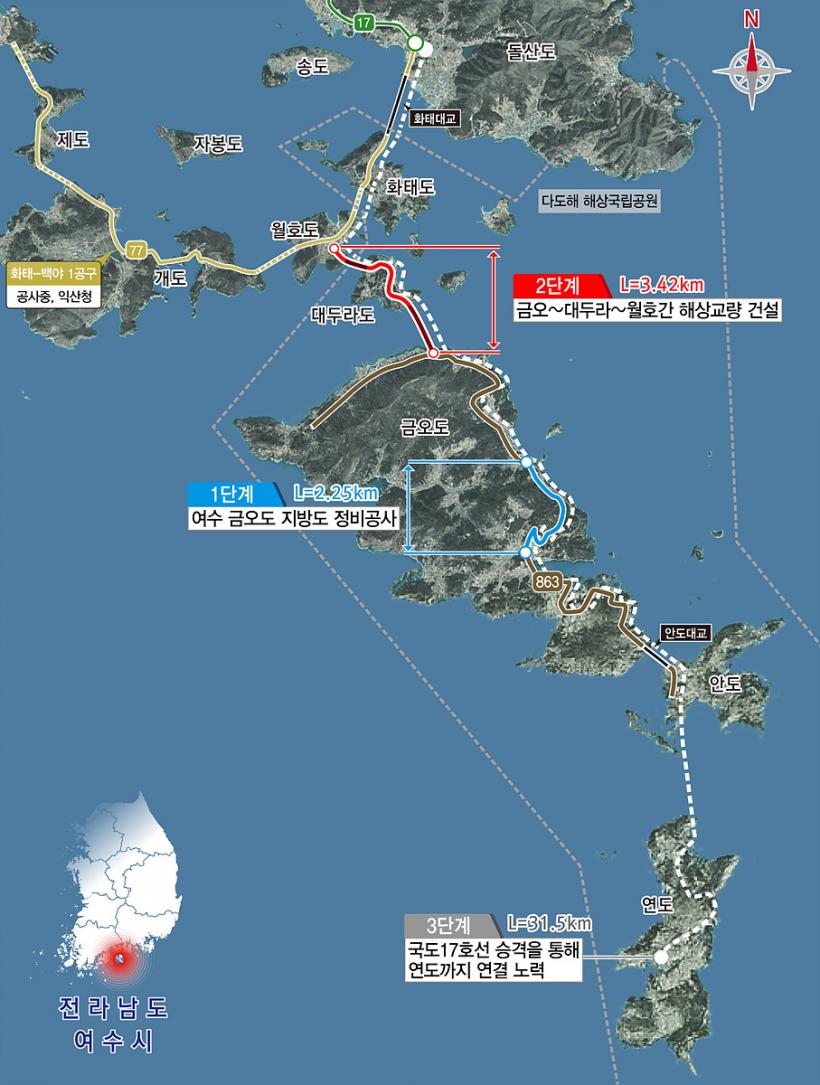 ±Ý¿Àµµ Áö¹æµµ Á¤ºñ°ø»ç´Â ÃÑ 3´Ü°è·Î ÃßÁøµÈ´Ù. 1´Ü°è ±Ý¿Àµµ ³» ±âÁ¸ µµ·ÎÆ÷Àå Á¤ºñ(¡¯26³â, L=2.25§°), 2´Ü°è ¿ùÈ£µµ~´ëµÎ¶óµµ~±Ý¿Àµµ ±¸°£ ÇØ»ó±³·®°Ç¼³(¡¯27~¡¯33³â, L=3.42§°), 3´Ü°è´Â Áö¹æµµ 863È£¼±À» ±¹µµ 17È£¼±À¸·Î ½Â°ÝÇÏ¿© ¿¬µµ±îÁö ¿¬°áÇÏ´Â °ø»ç·Î ÇöÀç´Â ±¸»ó´Ü°è¿¡ ÀÖ´Ù.