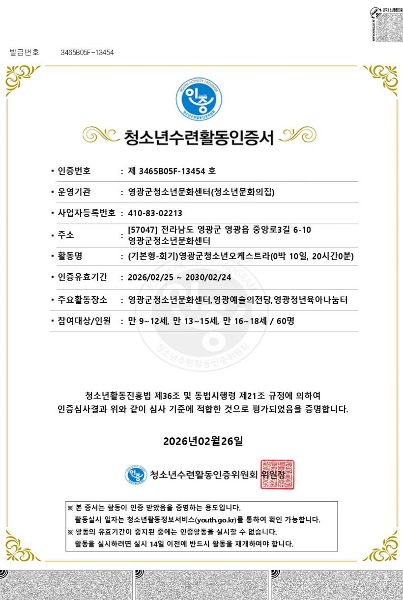 À̹ø ÀÎÁõÀº ¡¸Ã»¼Ò³âȰµ¿ÁøÈï¹ý¡¹ Á¦36Á¶ ¹× µ¿¹ý ½ÃÇà·É Á¦21Á¶¿¡ µû¶ó ¾ö°ÝÇÑ ½É»ç °úÁ¤À» °ÅÃÄ ÀÌ·ç¾îÁ³À¸¸ç, ÀÎÁõ¹øÈ£ Á¦3465B05F-13454È£·Î µî·ÏµÆ´Ù. ÀÎÁõ À¯È¿±â°£Àº 2026³â 2¿ù 25ÀϺÎÅÍ 2030³â 2¿ù 24ÀϱîÁö´Ù.