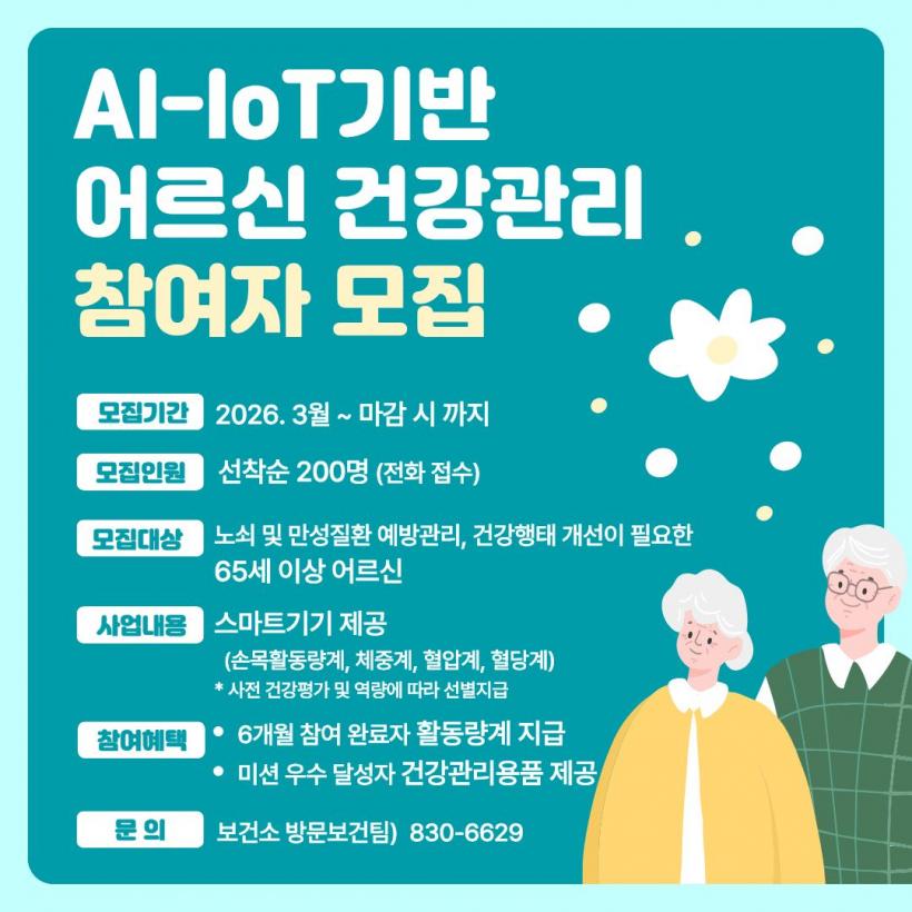 [°ø°£´º½º = ±è¿ëÁø±âÀÚ] °íÈﱺ(±º¼ö °ø¿µ¹Î)Àº Áö¿ª ¾î¸£½ÅÀÇ ¸¸¼ºÁúȯ ¿¹¹æ°ú °Ç° ÁõÁøÀ» À§ÇØ ¡®AI¡¤IoT ±â¹Ý ¾î¸£½Å °Ç°°ü¸®»ç¾÷¡¯ ½Å±Ô Âü¿©ÀÚ¸¦ ¸ðÁýÇÑ´Ù°í ¹àÇû´Ù.