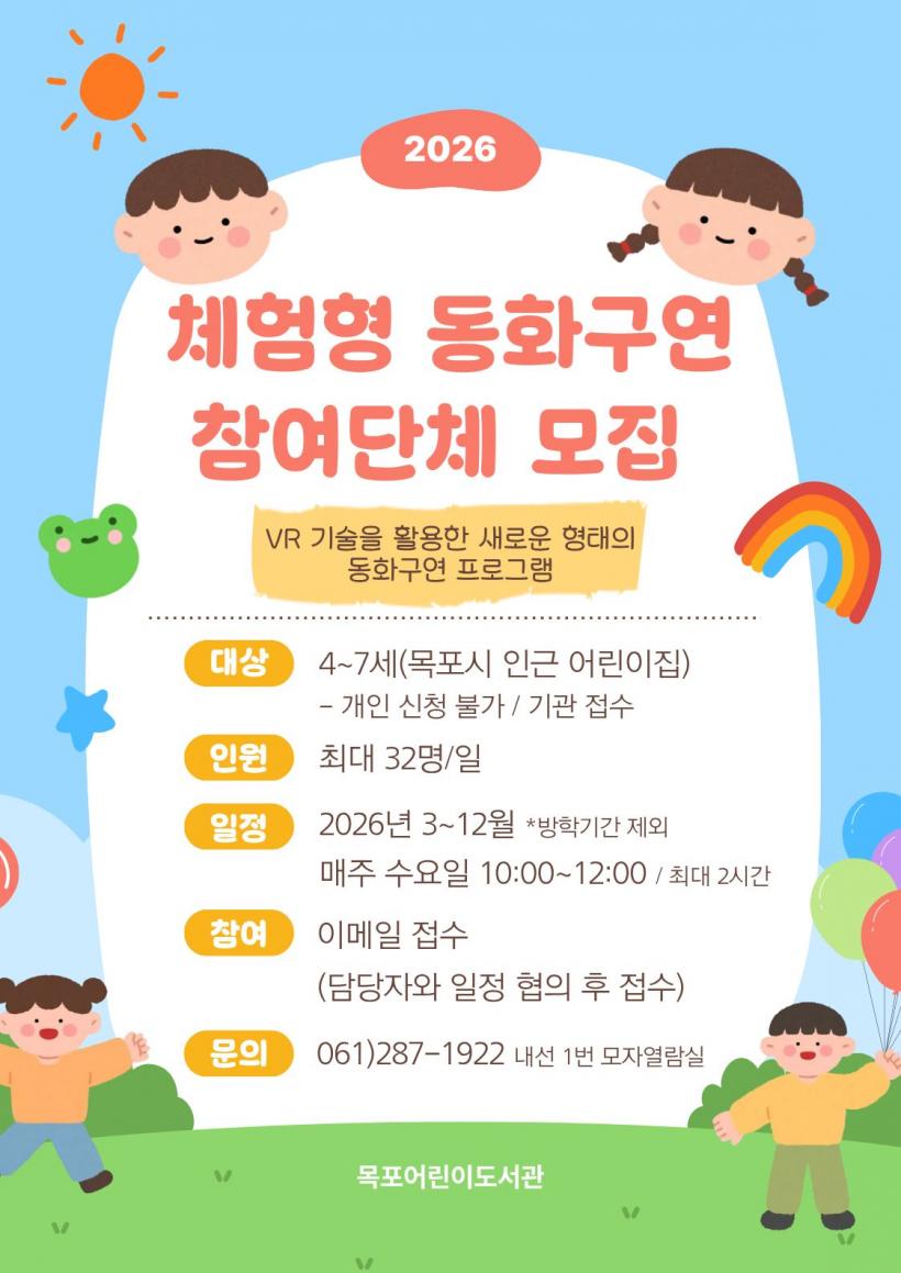 ÇÁ·Î±×·¥Àº ¸ñÆ÷ °ü³» ¾î¸°ÀÌÁý À¯¾Æ(4~5¼¼)¸¦ ´ë»óÀ¸·Î ¸ÅÁÖ ¼ö¿äÀÏ ¿ÀÀü 10½ÃºÎÅÍ 12½Ã±îÁö ¿î¿µµÈ´Ù. Âü¿©¸¦ Èñ¸ÁÇÏ´Â ±â°üÀº µµ¼°ü ´ã´çÀÚ(061-287-1922)¿Í »çÀü ÀÏÁ¤ ÇùÀǸ¦ °ÅÄ£ µÚ À̸ÞÀÏ·Î ½ÅûÇÏ¸é µÈ´Ù.