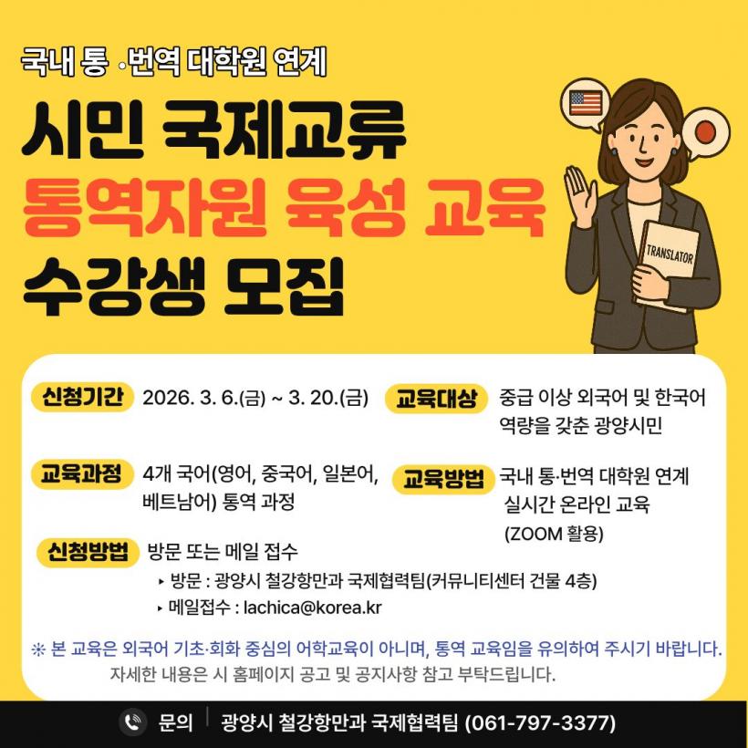 [°ø°£´º½º = Àå¿ÁÁø±âÀÚ] ±¤¾ç½Ã´Â ±¹Á¦ Àڸš¤¿ìÈ£µµ½Ã ±³·ù¿Í °¢Á¾ ±¹Á¦Çà»ç µî ±¹Á¦±³·ù ÇöÀå¿¡¼ Ȱµ¿ÇÒ Àü¹® Å뿪 ÀηÂÀ» ü°èÀûÀ¸·Î À°¼ºÇϱâ À§ÇØ ¡®±¹³» Å롤¹ø¿ª ´ëÇпø ¿¬°è ½Ã¹Î ±¹Á¦±³·ù Å뿪ÀÚ¿ø À°¼º ±³À°¡¯ ¼ö°»ýÀ» 3¿ù 6ÀϺÎÅÍ 20ÀϱîÁö ¸ðÁýÇÑ´Ù.
