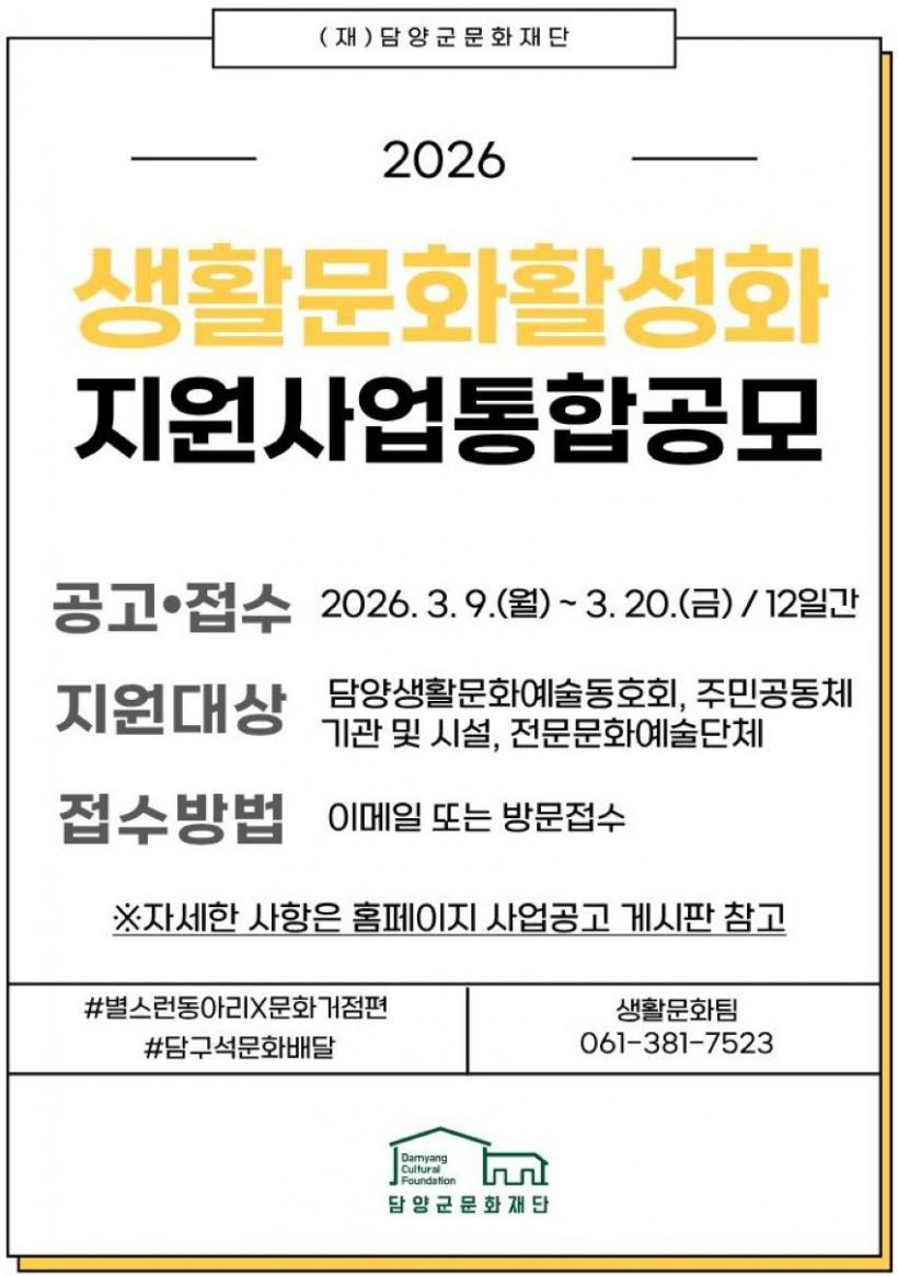 [°ø°£´º½º = ±è¼ö±Ù±âÀÚ] ´ã¾ç±º¹®ÈÀç´Ü(ÀÌ»çÀå Á¤Ã¶¿ø, ÀÌÇÏ Àç´Ü)Àº Áö¿ªÁÖ¹ÎÀÇ »ýȰ¹®È Âü¿© È®´ë¿Í ¹®È¿¹¼ú Ȱµ¿ Ȱ¼ºÈ¸¦ À§ÇØ ¡®2026 »ýȰ¹®ÈȰ¼ºÈ Áö¿ø»ç¾÷ °ø¸ð¡¯¸¦ ÃßÁøÇÑ´Ù°í ¹àÇû´Ù.