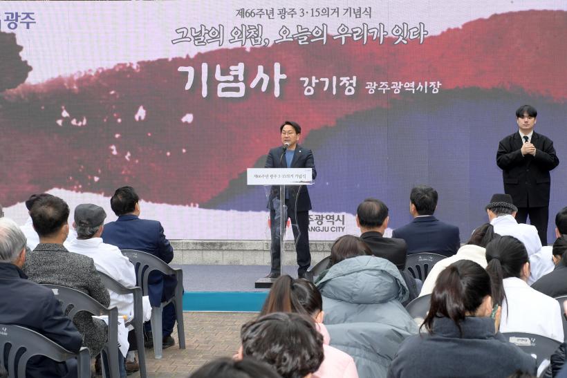 °±âÁ¤ ±¤ÁÖ½ÃÀåÀº ¡°3‧15ÀǰÅÀÇ ¿ÜħÀº 4‧19Çõ¸íÀ¸·Î À̾îÁ³°í, 4‧19ÀÇ µéºÒÀº 1980³â 5¿ù ´ëµ¿ ¼¼»ó°ú 1987³â 6¿ù Ç×ÀïÀ¸·Î ¹øÁ® ³ª°¬´Ù¡±¸ç ¡°3‧15ÀǰŰ¡ ½Ã¹ÎÀÇ ¿¬´ë·Î ¿ª»ç¸¦ ¹Ù²Ù¾úµí ¿À´ÃÀÇ ¿ì¸® ¶ÇÇÑ Çù·Â°ú »ó»ýÀÇ Á¤½ÅÀ¸·Î Áö¿ªÀÇ ¹Ì·¡¸¦ ÇÔ²² ¿¾î°¡¾ß ÇÑ´Ù¡±°í ¹àÇû´Ù.
