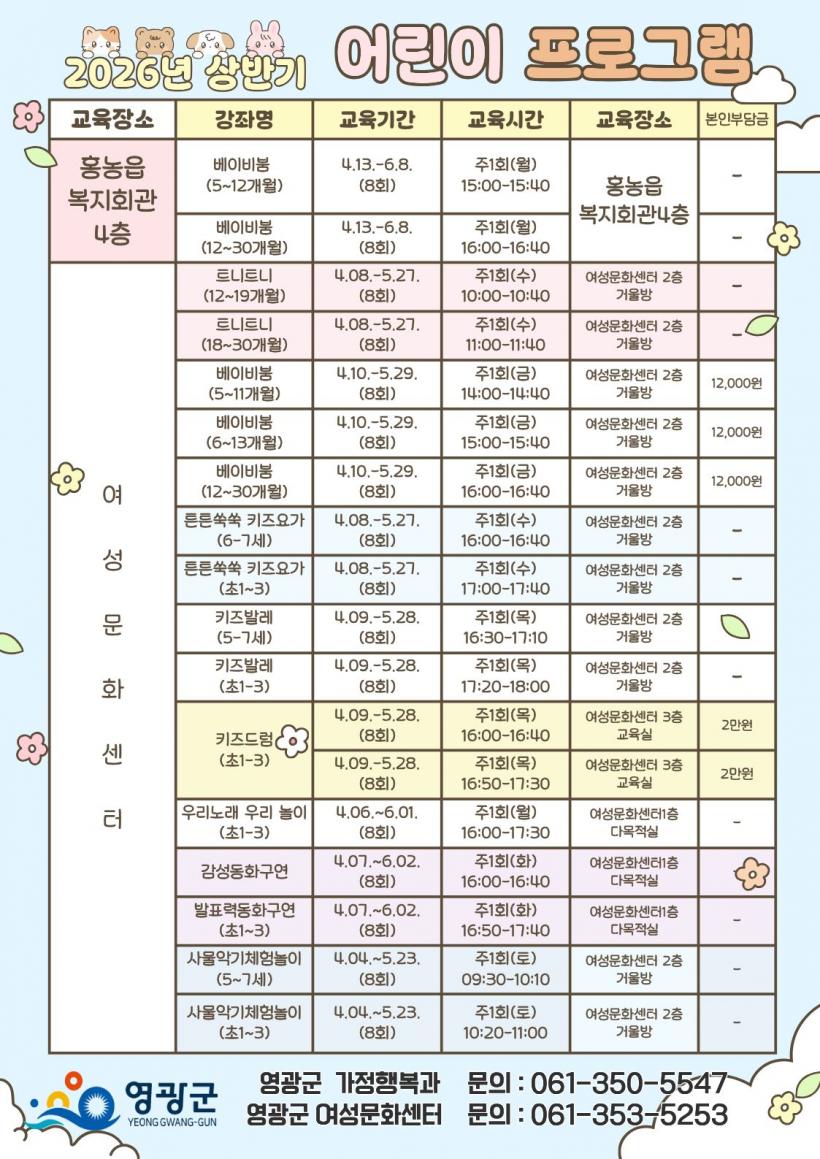 [°ø°£´º½º = ±è¼ö±Ù±âÀÚ] ¿µ±¤±ºÀº ¾î¸°ÀÌÀÇ °Ç°ÇÑ ¼ºÀå°ú ´Ù¾çÇÑ ¹®È¡¤¿¹¼ú üÇè ±âȸ¸¦ Á¦°øÇϱâ À§ÇØ ¿À´Â 3¿ù 30ÀϺÎÅÍ 4¿ù 1ÀϱîÁö 2026³â »ó¹Ý±â ¾î¸°ÀÌ ÇÁ·Î±×·¥ ¼ö°»ýÀ» ¸ðÁýÇÑ´Ù°í ¹àÇû´Ù.
