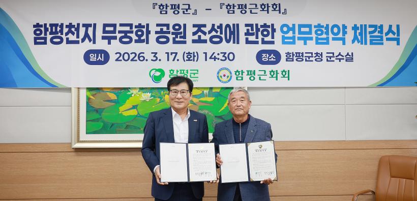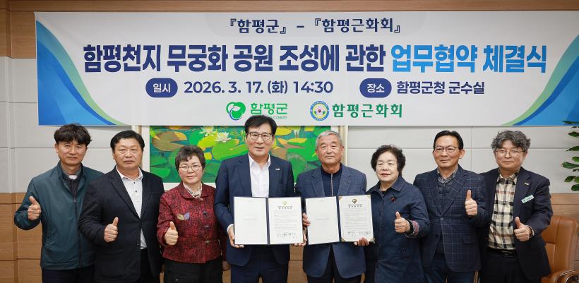 [°ø°£´º½º = Àå¿ÁÁø±âÀÚ] Àü³² ÇÔÆò±ºÀÌ ³ª¶ó²É ¹«±ÃÈÀÇ Àúº¯ È®´ë¿Í ÇÔÆòõÁö ¹«±ÃÈ °ø¿ø Á¶¼ºÀ» À§ÇØ ÇÔÆò±ÙÈȸ(ȸÀå Á¤Ãµ¼ö)¿Í ¾÷¹«Çù¾àÀ» ü°áÇß´Ù.