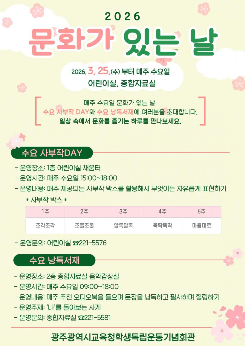 [°ø°£´º½º = ±è¼ö±Ù±âÀÚ] ±¤Áֽñ³À°Ã»Çлýµ¶¸³¿îµ¿±â³äȸ°ü(ÀÌÇÏ Çлýµ¶¸³¿îµ¿±â³äȸ°ü)Àº ¿À´Â 25ÀϺÎÅÍ ¸ÅÁÖ ¼ö¿äÀÏ ¿À°¨ üÇèÇü ¹®È Çà»ç ¡®¹®È°¡ ÀÖ´Â ³¯¡¯À» ¿î¿µÇÑ´Ù.