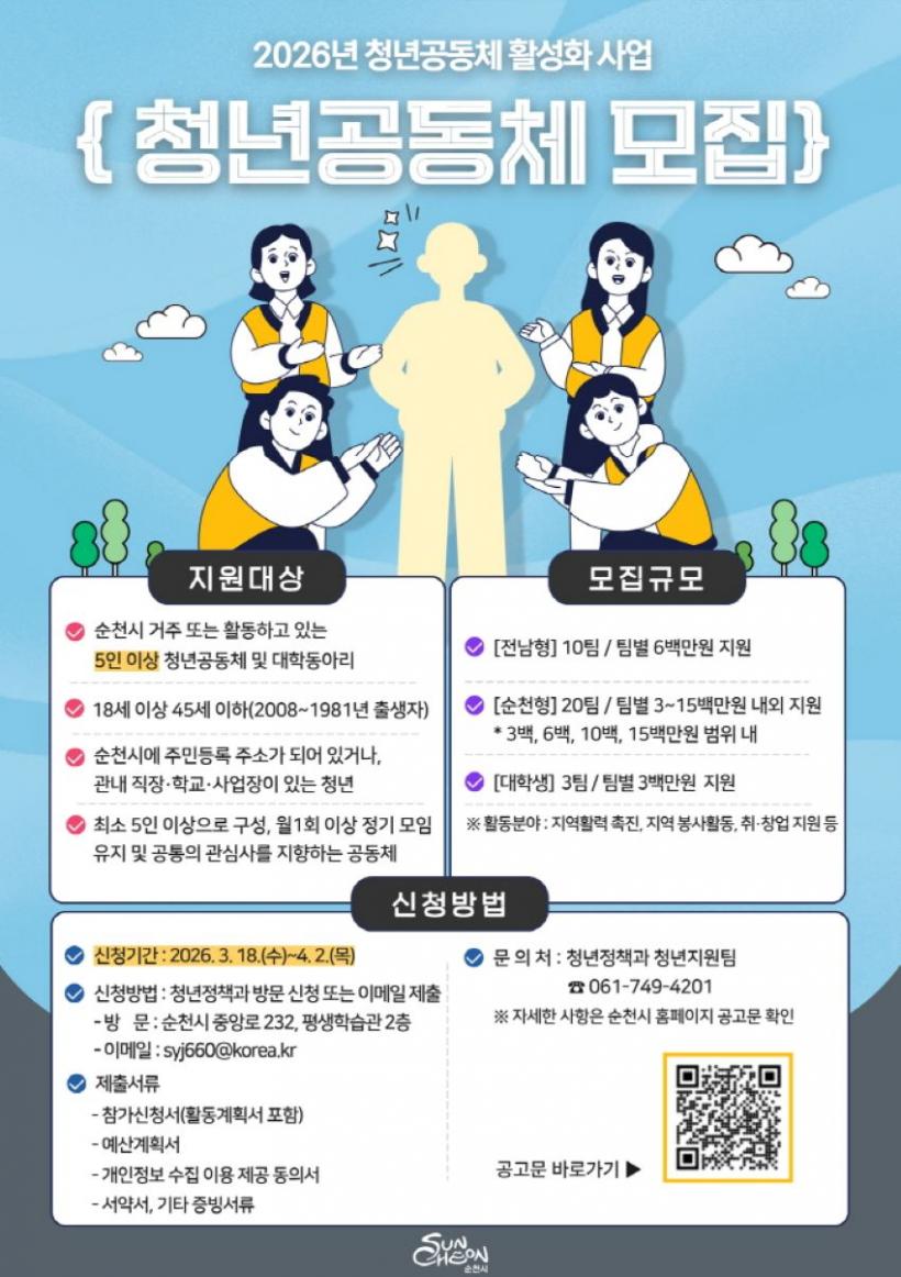 [°ø°£´º½º = ¹Ú¼º¿Á±âÀÚ] ¼øÃµ½Ã´Â û³âµéÀÇ ¾ÆÀ̵ð¾î¿Í ÄÜÅÙÃ÷·Î Áö¿ª ³»¿¡¼ ÆîÄ¡´Â ´Ù¾çÇÑ È°µ¿À» Áö¿øÇÏ´Â 2026³â 「û³â°øµ¿Ã¼ Ȱ¼ºÈ »ç¾÷」ÀÇ Âü¿© °øµ¿Ã¼¸¦ ¸ðÁýÇÑ´Ù°í ¹àÇû´Ù.