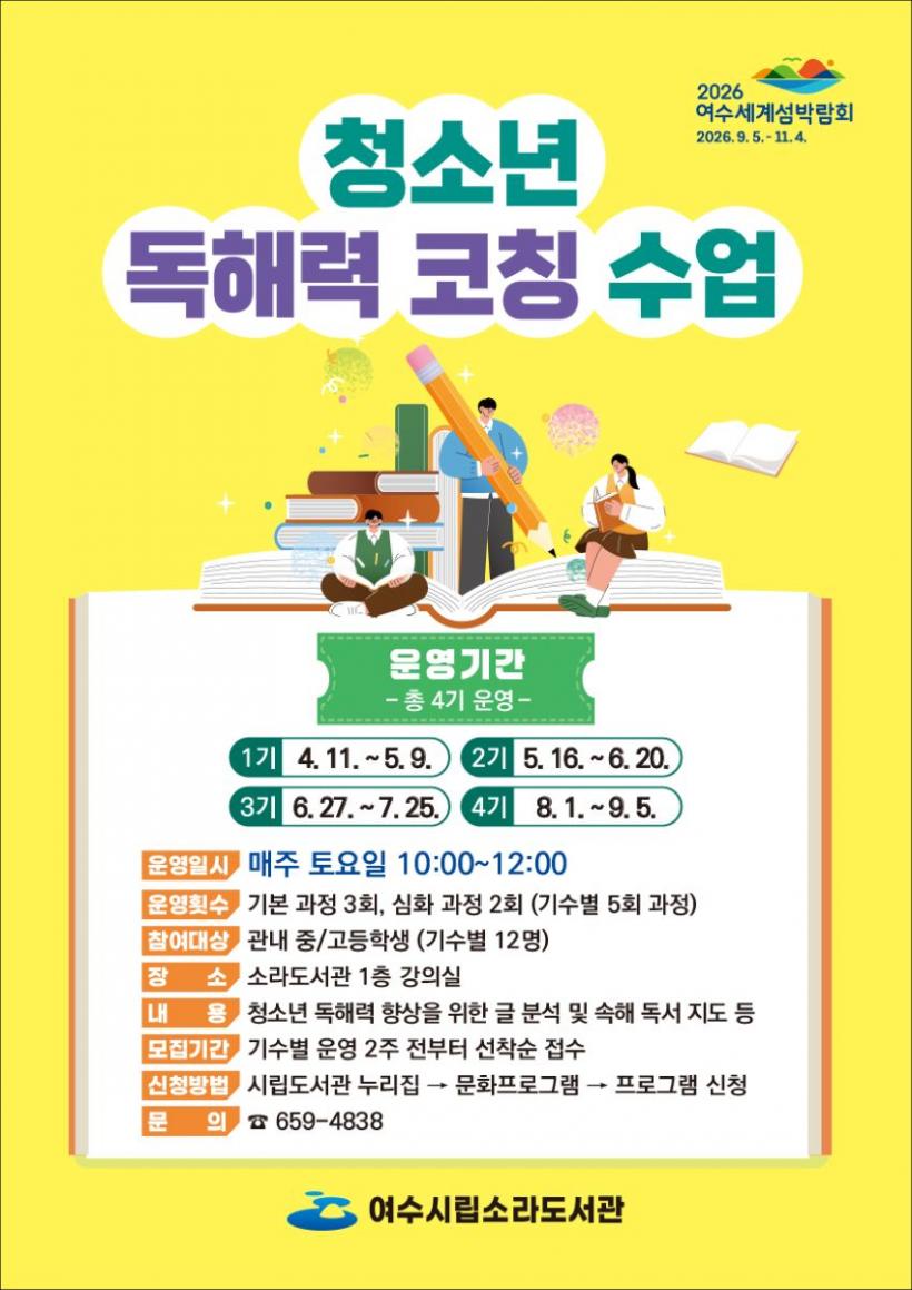 [°ø°£´º½º = ¾ÈÀ翵±âÀÚ] ¿©¼ö½Ã´Â ¿À´Â 4¿ù 11ÀϺÎÅÍ °ü³» Áß¡¤°íµîÇлýÀ» ´ë»óÀ¸·Î ¡®Ã»¼Ò³â µ¶ÇØ·Â ÄÚĪ ¼ö¾÷¡¯ ÇÁ·Î±×·¥À» ¿î¿µÇÑ´Ù°í ¹àÇû´Ù.