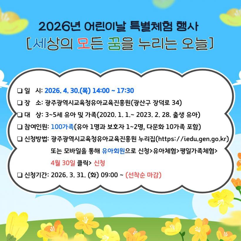 [°ø°£´º½º = ±è¼ö±Ù±âÀÚ] ±¤Áֽñ³À°Ã»À¯¾Æ±³À°ÁøÈï¿ø(ÀÌÇÏ ±¤ÁÖÀ¯¾Æ±³À°ÁøÈï¿ø)Àº ¡®Á¦104ȸ ¾î¸°À̳¯¡¯À» ¸Â¾Æ ¿À´Â 4¿ù 30ÀÏ º»¿ø ½Ç³»¡¤¿Ü üÇ迵¿ª ¹× ½Ãû°¢½Ç µî¿¡¼ ¾î¸°À̳¯ Ưº° °¡Á·Ã¼Çè ¡®¼¼¡¤¸ð¡¤²Þ(¼¼»óÀÇ ¸ðµç ²ÞÀ» ´©¸®´Â ¿À´Ã)¡¯ Çà»ç¸¦ °³ÃÖÇÑ´Ù.
