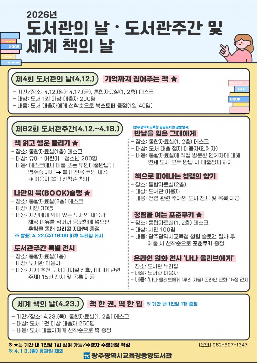 ÀÚ¼¼ÇÑ ³»¿ëÀº º»°ü ´©¸®Áý(https://lib.gen.go.kr/jungang/)¡¤ºÐ°ü ´©¸®Áý(https://lib.gen.go.kr/seokbong/) ¶Ç´Â º»°ü ¹®ÇåÁ¤º¸°ú(062-607-1347)¡¤ºÐ°ü ¹®ÇåÁ¤º¸°ú(062-570-8131)¿¡¼ È®ÀÎÇÏ¸é µÈ´Ù.