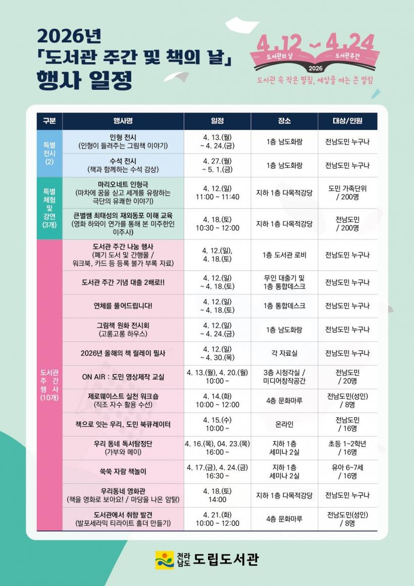 [°ø°£´º½º = ±è¼ö±Ù±âÀÚ] Àü³²µµ¸³µµ¼°üÀº ¡®µµ¼°ü ÁÖ°£¡¯°ú ¡®Ã¥ÀÇ ³¯(23ÀÏ)¡¯À» ±â³äÇØ ¿À´Â 12ÀϺÎÅÍ 5¿ù 1ÀϱîÁö µµ¹ÎÀÇ µ¶¼¹®È ÇâÀ¯¸¦ À§ÇÑ Æ¯º°Àü½Ã¿Í Ưº°°¿¬, Ưº°°ø¿¬ µî ´Ùä·Î¿î µ¶¼ ¹®È Çà»ç¸¦ °³ÃÖÇÑ´Ù.