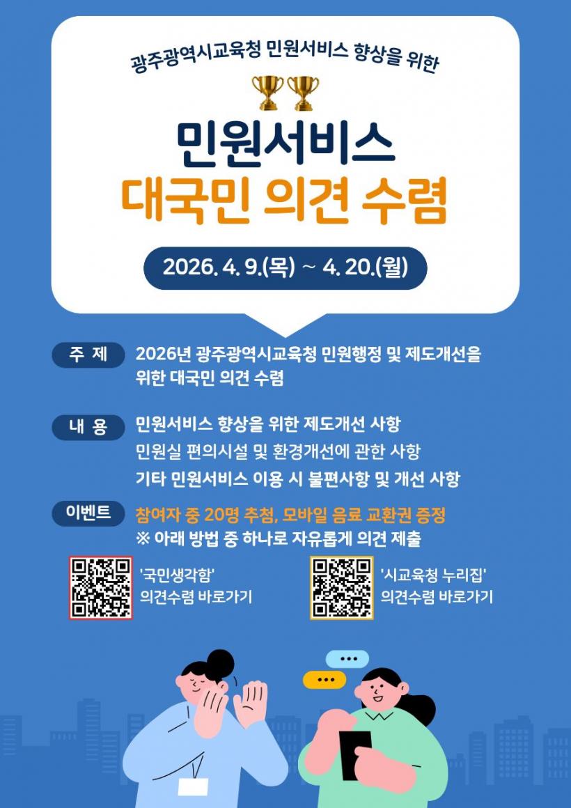 [°ø°£´º½º = ±è¼ö±Ù±âÀÚ] ±¤Áֽñ³À°Ã»Àº ¹Î¿ø¼ºñ½º ǰÁú Çâ»óÀ» À§ÇØ ¿À´Â 9~20ÀÏ ±¹¹Î±ÇÀÍÀ§¿øÈ¸ ¿Â¶óÀÎ Á¤Ã¥Âü¿© Ç÷§Æû ¡®±¹¹Î»ý°¢ÇÔ¡¯°ú ¡®½Ã±³À°Ã» ´©¸®Áý¡¯À» ÅëÇØ ´ë±¹¹Î ÀǰßÀ» ¼ö·ÅÇÑ´Ù.