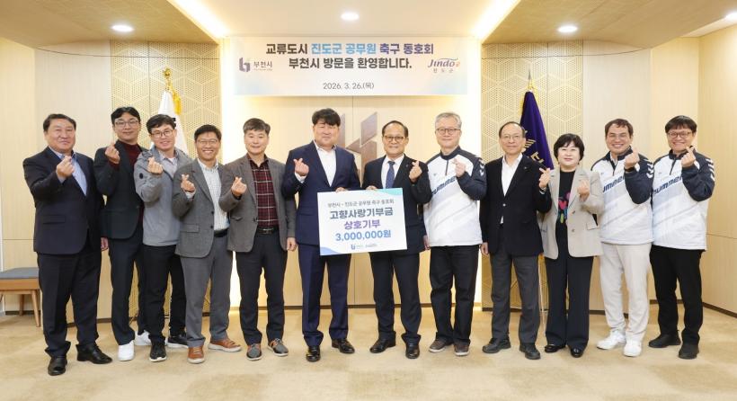 [°ø°£´º½º = Àå¿ÁÁø±âÀÚ] Áøµµ±º°ú ºÎõ½Ã°¡ Àڸŵµ½Ã °£ ±³·ù¸¦ Ȱ¼ºÈÇϱâ À§ÇØ ÃßÁøÇÑ ¡®Ã౸µ¿È£È¸ Ä£¼± ±³·ù Çà»ç¡¯¿¡¼ °íÇâ»ç¶û±âºÎ±Ý 300¸¸ ¿øÀ» »óÈ£ ±âºÎÇϸç, ¾ç ÁöÀÚü °£ÀÇ Çù·Â °ü°è¸¦ ÇÑÃþ °ÈÇß´Ù.