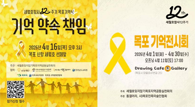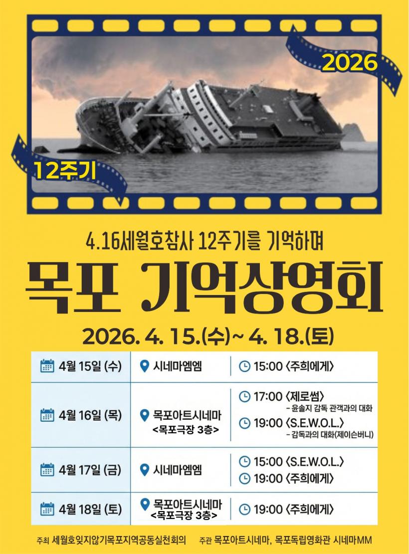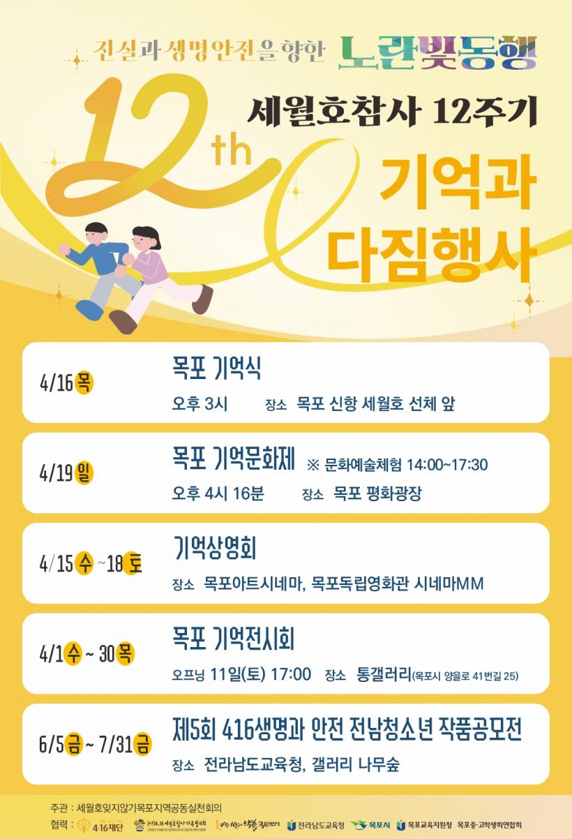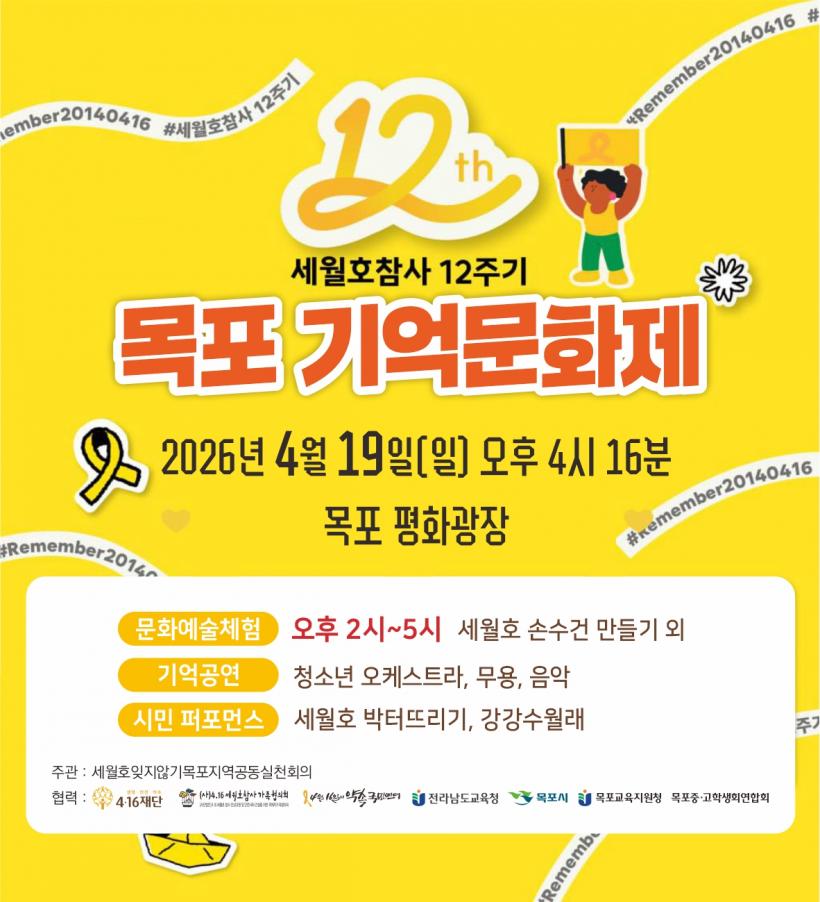 4¿ù 19ÀÏ¿¡´Â ¸ñÆ÷ Æòȱ¤Àå¿¡¼ ¡°¼¼¿ùÈ£ Âü»ç 12Áֱ⠱â¾ï¹®ÈÁ¦¡±°¡ ¿¸°´Ù. ¡®Áø½Ç°ú »ý¸í¾ÈÀüÀ» À§ÇÑ ³ë¶õºû µ¿Ç࡯ÀÇ ÁÖÁ¦·Î ÁøÇàµÇ´Â À̹ø ±â¾ï¹®ÈÁ¦´Â ¸ñÆ÷Áö¿ªÀÇ Ã»¼Ò³âµéÀÌ Çϴóª¶óÀÇ ¾ð´Ï ¿Àºü¿¡°Ô º¸³»´Â ±â¾ïÆíÁö ³¶¼Û°ú ±¹¾Ç, ¹«¿ë, û¼Ò³â¿ÀÄɽºÆ®¶ó ¿¬ÁÖ µî ´Ù¾çÇÑ °ø¿¬À» ÅëÇØ Èñ»ýÀÚ¸¦ ±â¾ïÇÏ´Â ½Ã°£À» °¡Áú ¿¹Á¤ÀÌ´Ù.