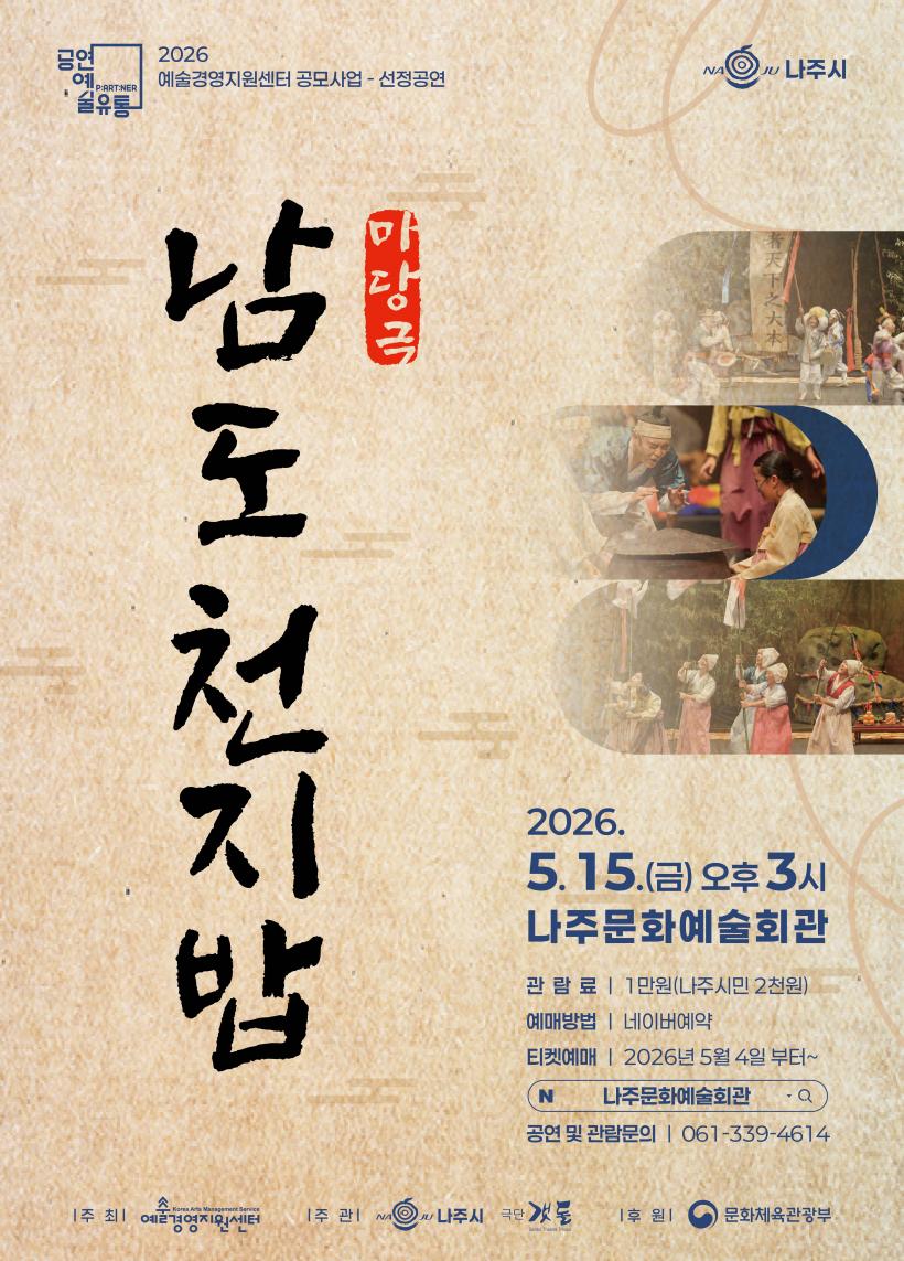 À̹ø °ø¿¬Àº ¡®2026 °ø¿¬¿¹¼ú Áö¿ªÀ¯Åë Áö¿ø»ç¾÷¡¯¿¡ ¼±Á¤µÅ (Àç)¿¹¼ú°æ¿µÁö¿ø¼¾ÅͰ¡ ÁÖÃÖÇÏ°í ³ªÁֽð¡ ÁÖ°üÇÏ¸ç ¹®ÈüÀ°°ü±¤ºÎ ÈÄ¿øÀ¸·Î ÁøÇàµÈ´Ù.