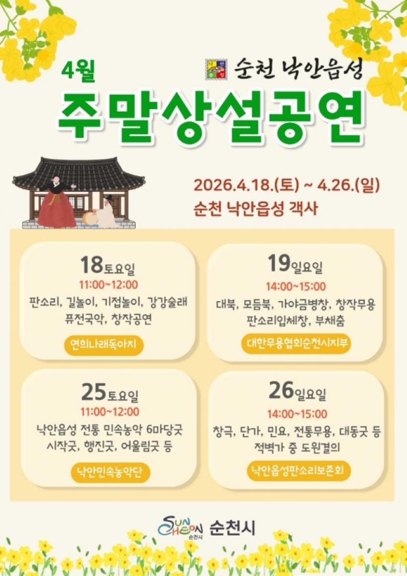 [°ø°£´º½º = ±è¿ëÁø±âÀÚ] ¼øÃµ½Ã´Â ¿À´Â 18ÀϺÎÅÍ ÁÖ¸»°ú °øÈÞÀÏ¿¡ ¼øÃµ ³«¾ÈÀ¾¼º °´»ç¿¡¼ ´Ùä·Î¿î ÁÖ¸»»ó¼³°ø¿¬À» °³ÃÖÇÑ´Ù°í ¹àÇû´Ù.