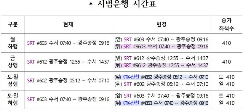 ÁÖ¸»ÀÎ Å䡤ÀÏ¿äÀÏ¿¡´Â ±âÁ¸ ¿îÇàÇÏ´ø 410¼® ±Ô¸ðÀÇ SRT¿¡ 410¼®ÀÇ KTX-»êõÀ» Ãß°¡·Î ¿¬°áÇÏ´Â ¹æ½ÄÀ» Àû¿ë, ÃÑ Á¼® °ø±Þ ±Ô¸ð¸¦ 820¼®À¸·Î µÎ ¹è ´Ã¸°´Ù.