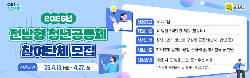[°ø°£´º½º = ±è¼ö±Ù±âÀÚ] Àü¶ó³²µµ°¡ û³âÀÇ Áö¿ª Á¤Âø°ú Ȱµ¿ ±â¹Ý ¸¶·ÃÀ» À§ÇØ ¡®2026 Àü³²Çü û³â°øµ¿Ã¼ Ȱ¼ºÈ »ç¾÷¡¯¿¡ Âü¿©ÇÒ 102°³ ÆÀÀ» ¸ðÁýÇÑ´Ù.