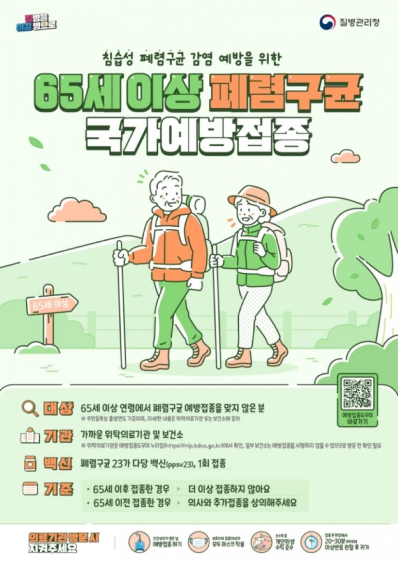 65¼¼ ÀÌ»ó Æó·Å±¸±Õ ¹«·á ¿¹¹æÁ¢Á¾Àº ÁÖ¼ÒÁö¿Í »ó°ü¾øÀÌ °¡±î¿î º¸°Ç¼Ò³ª À§Å¹ ÀÇ·á±â°ü¿¡¼ Æó·Å±¸±Õ 23°¡ ´Ù´çÁú¹é½Å(PPSV23)À» 1ȸ Á¢Á¾Çϸç, 65¼¼ ÀÌÈÄ ÀÌ¹Ì Á¢Á¾ÇÑ °æ¿ì Ãß°¡ Á¢Á¾ÇÒ ÇÊ¿ä´Â ¾ø´Ù.