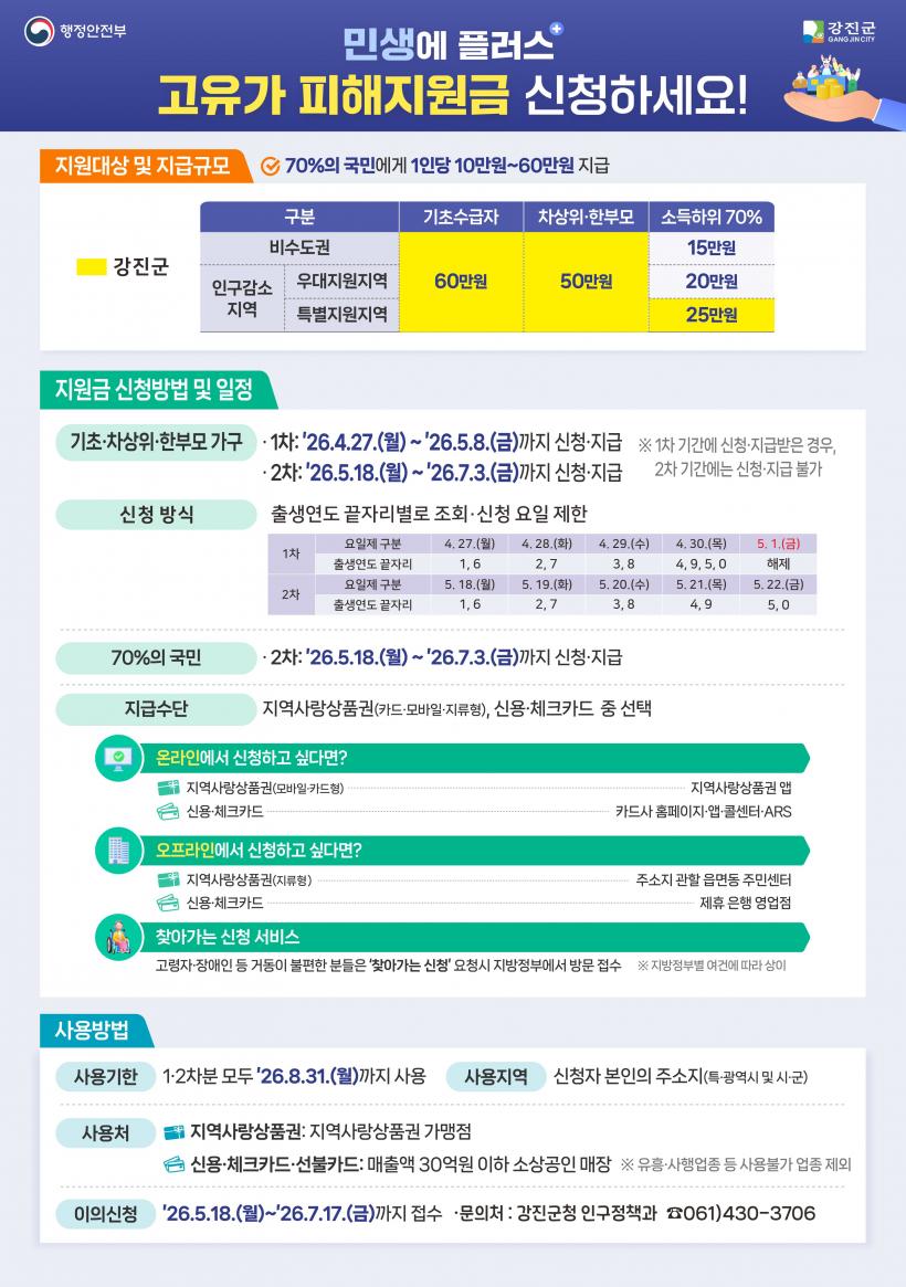 Áö¿ª»ç¶û»óǰ±ÇÀº °Áø±º ³» °¡¸ÍÁ¡¿¡¼ »ç¿ëÇÒ ¼ö ÀÖ°í, ½Å¿ë¡¤Ã¼Å©Ä«µå´Â ¿¬¸ÅÃâ 30¾ï¿ø ÀÌÇÏ ¼Ò»ó°øÀξ÷ü µî¿¡¼ °¡´ÉÇÏ´Ù. »ç¿ë±âÇÑÀº 2026³â 8¿ù 31ÀϱîÁöÀ̸ç, ±âÇÑ ³» »ç¿ëÇÏÁö ¸ø ÇÒ °æ¿ì Áö¿ø±ÝÀº ¼Ò¸êÇÑ´Ù.
