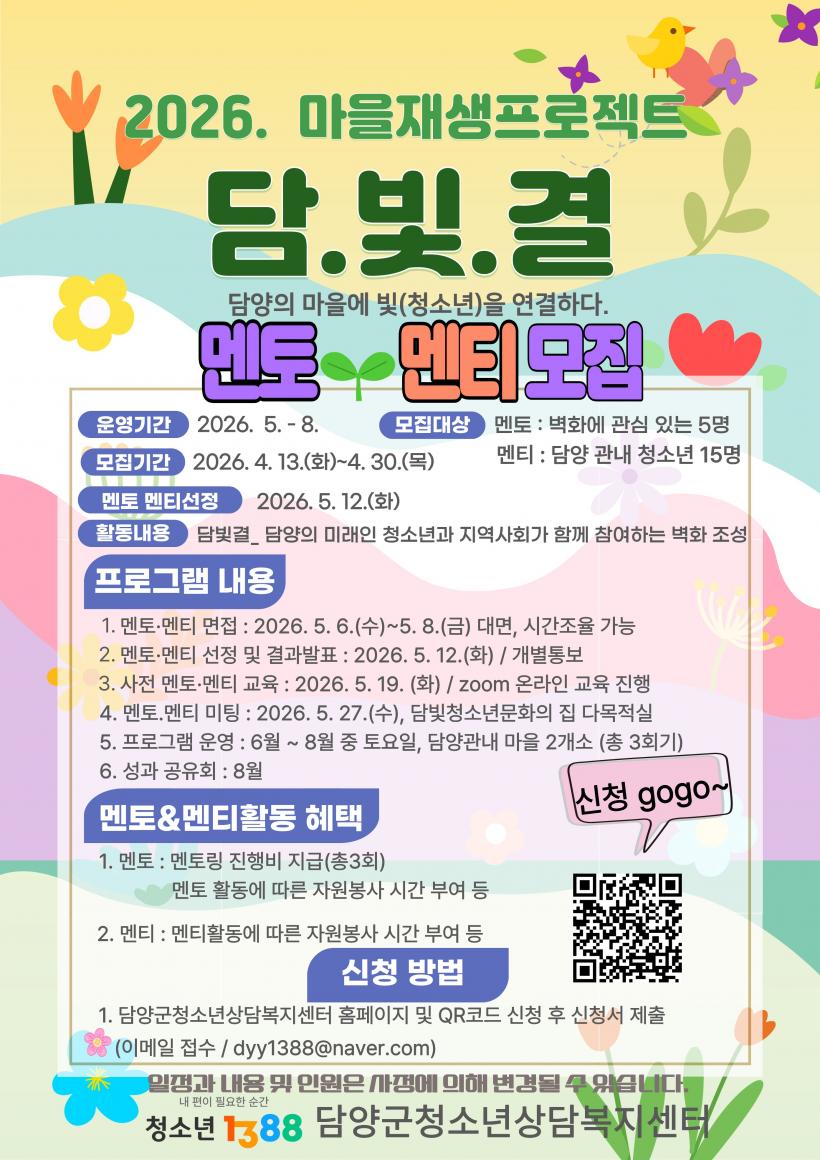 [°ø°£´º½º = ±è¼ö±Ù±âÀÚ] ´ã¾ç±ºÃ»¼Ò³â»ó´ãº¹Áö¼¾ÅͰ¡ Áö¿ª û¼Ò³âÀÌ Á÷Á¢ Âü¿©ÇØ ¸¶À» ȯ°æÀ» °³¼±ÇÏ°í °øµ¿Ã¼ ÀǽÄÀ» ȸº¹ÇÏ´Â ¡®2026³â ¸¶À»Àç»ý»ç¾÷ ´ã¡¤ºû¡¤°á¡¯ÀÇ ¸àÅä¿Í ¸àƼ¸¦ ¿À´Â 30ÀϱîÁö ¸ðÁýÇÑ´Ù.