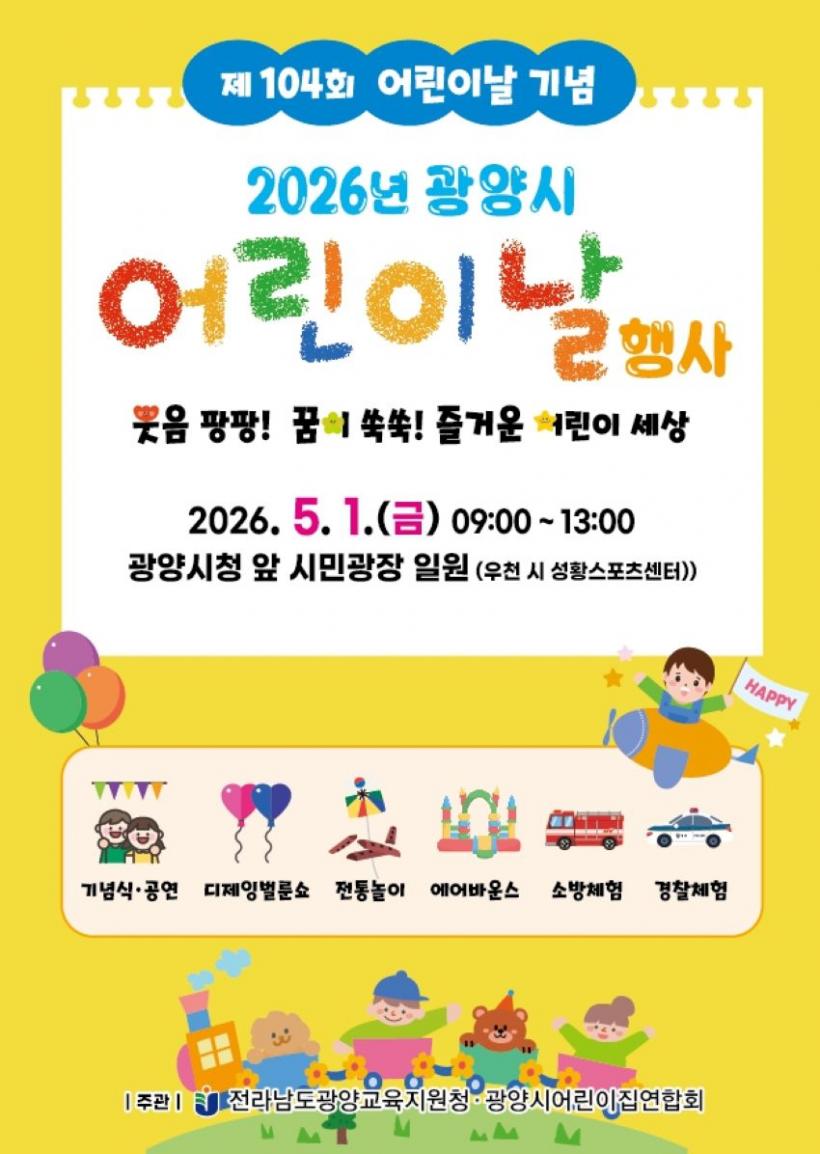 [°ø°£´º½º = Àå¿ÁÁø±âÀÚ] ±¤¾ç½Ã´Â Á¦104ȸ ¾î¸°À̳¯À» ¸Â¾Æ ¿À´Â 5¿ù 1ÀÏ ±¤¾ç½Ãû ¾Õ ±¤¾ç½Ã¹Î±¤Àå ÀÏ¿ø¿¡¼ Àü¶ó³²µµ±¤¾ç±³À°Áö¿øÃ»°ú ±¤¾ç½Ã¾î¸°ÀÌÁý¿¬ÇÕȸ ÁÖ°üÀ¸·Î ¡®2026³â ±¤¾ç½Ã ¾î¸°À̳¯ Çà»ç¡¯¸¦ ¿¬´Ù°í ¹àÇû´Ù.