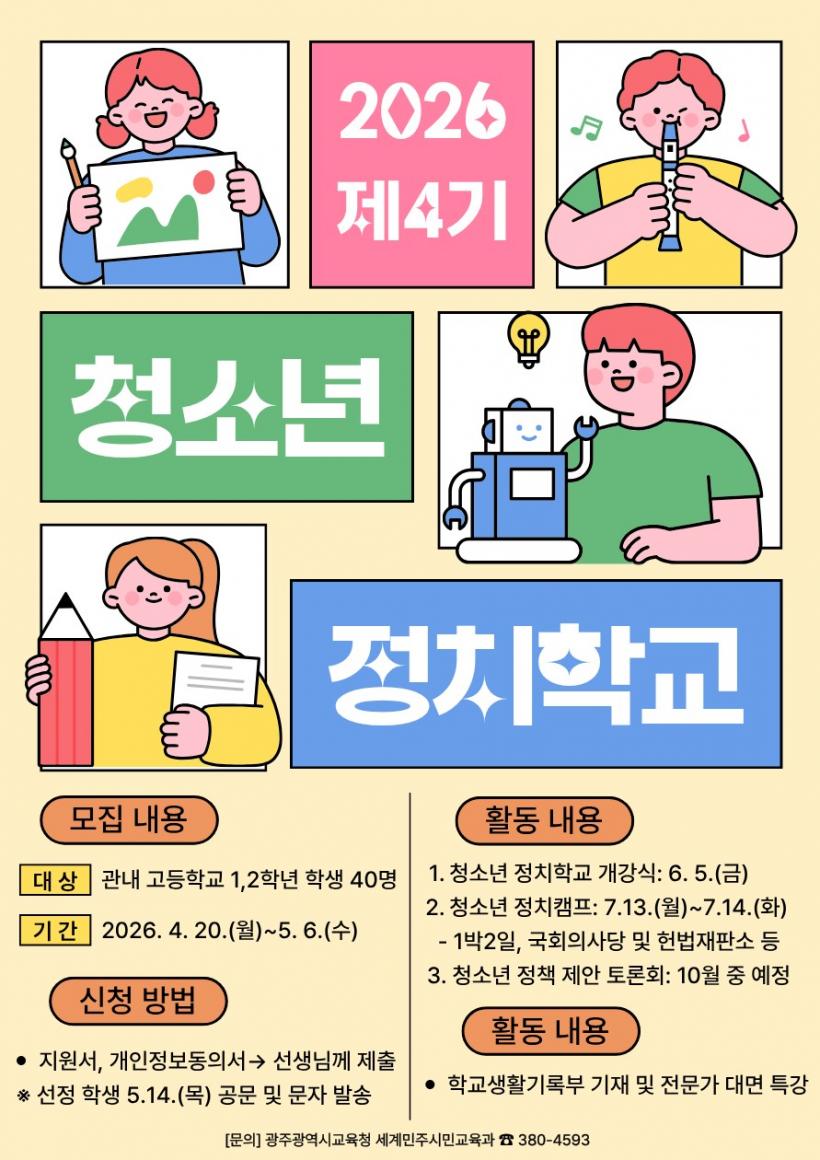 [°ø°£´º½º = ±è¼ö±Ù±âÀÚ] ±¤Áֽñ³À°Ã»Àº û¼Ò³âÀÇ Á¤Ä¡Âü¿© ¿ª·®À» Ű¿ì±â À§ÇØ ¡®Á¦4±â û¼Ò³â Á¤Ä¡Çб³¡¯ Âü°¡ÀÚ¸¦ ¸ðÁýÇÑ´Ù.