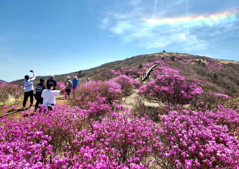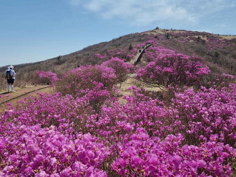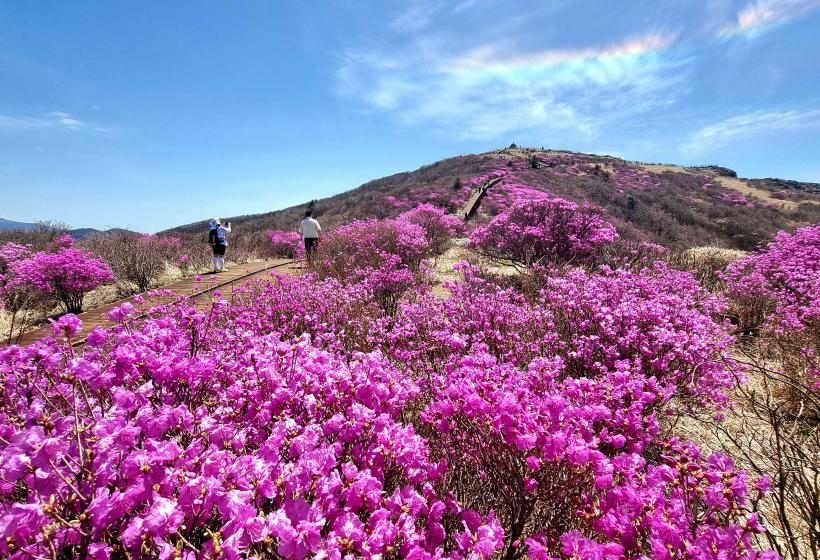 Áö¸®»ê ³ë°í´ÜÀº ÇØ¹ß 1,500m °íÁö´ë¿¡¼ ´Êº½¿¡ Áø´Þ·¡°¡ ¸¸°³ÇØ ºÐÈ«ºû ¹°°áÀ» ÀÌ·ç´Â ¸í¼Ò·Î, 4¿ù ¸»~5¿ù Ãʰ¡ ÀýÁ¤ ½Ã±âÀÔ´Ï´Ù. ÇöÀç(2026³â 4¿ù ¸») ³ë°í´Ü ÀÏ´ë´Â Áø´Þ·¡°¡ Ȱ¦ ÇÇ¾î º½ÀÇ ÀýÁ¤À» ¾Ë¸®°í ÀÖ´Ù.