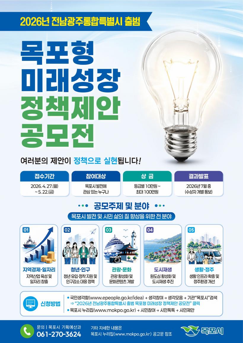 [°ø°£´º½º = ¹Ú¼º¿Á±âÀÚ] ¸ñÆ÷½Ã°¡ Àü³²¡¤±¤ÁÖ ÅëÇÕÆ¯º°½Ã Ãâ¹ü¿¡ ´ëºñÇϰí Áö¿ªÀÇ ¹Ì·¡ ¼ºÀ嵿·ÂÀ» ¹ß±¼Çϱâ À§ÇØ ¡®¸ñÆ÷Çü ¹Ì·¡¼ºÀå Á¤Ã¥Á¦¾È °ø¸ðÀü¡¯À» °³ÃÖÇÑ´Ù.
